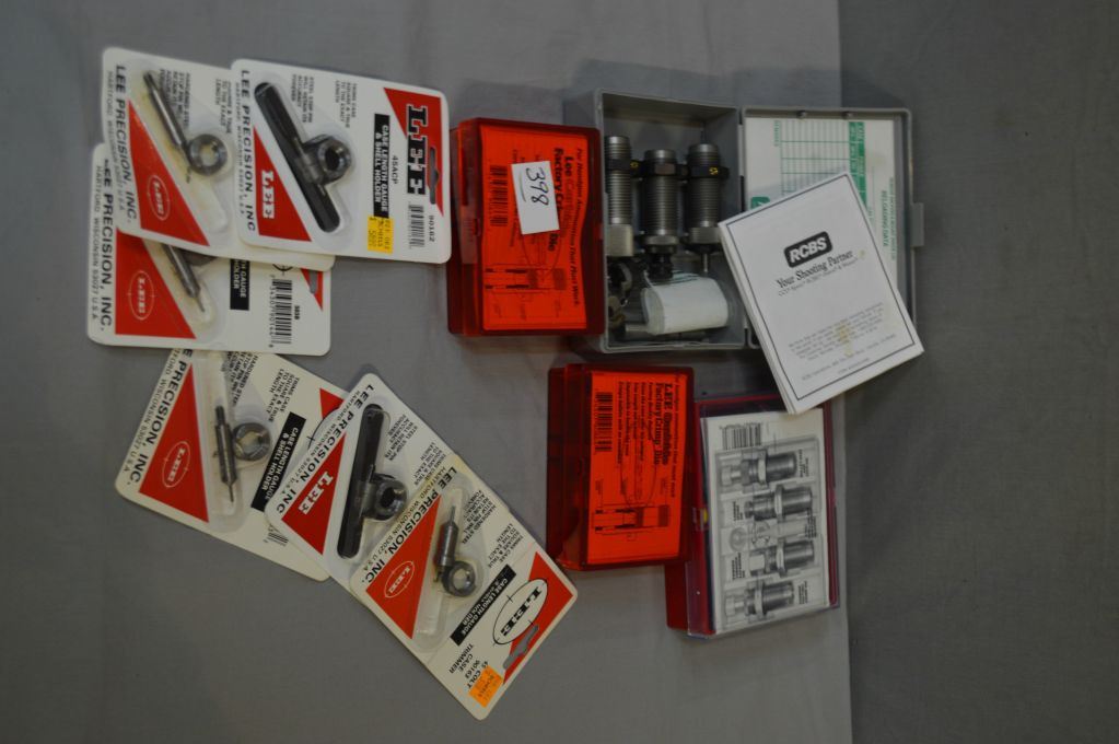 Tray Lot : RCBS Carbide .45 Colt Cal Three Die Set - Lee Deluxe .45 ACP / .45 Auto Rim Cal Die Set - Lee Carbide .45 ACP / Auto Rim / .45 Win Mag Crimp Die - Lee Carbide .45 Colt / 454 Casull Crimp Die - Six Lee Case Length Gauge & Shell Holders [ in orig pkgs ]