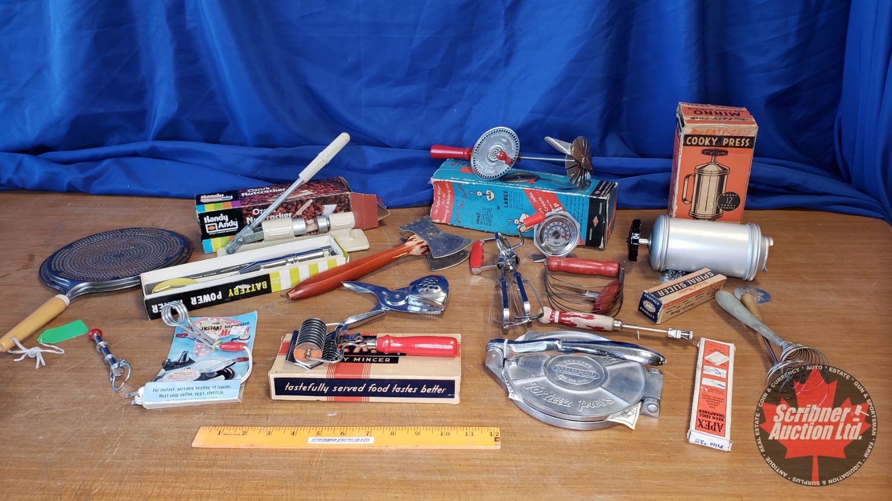 Tray Lot: Retro Kitchen Gadgets (Incl: Cookie Press, Battery Power Mixer, Jiffy Whip, Instant Immersion Heater, etc (See Pics)