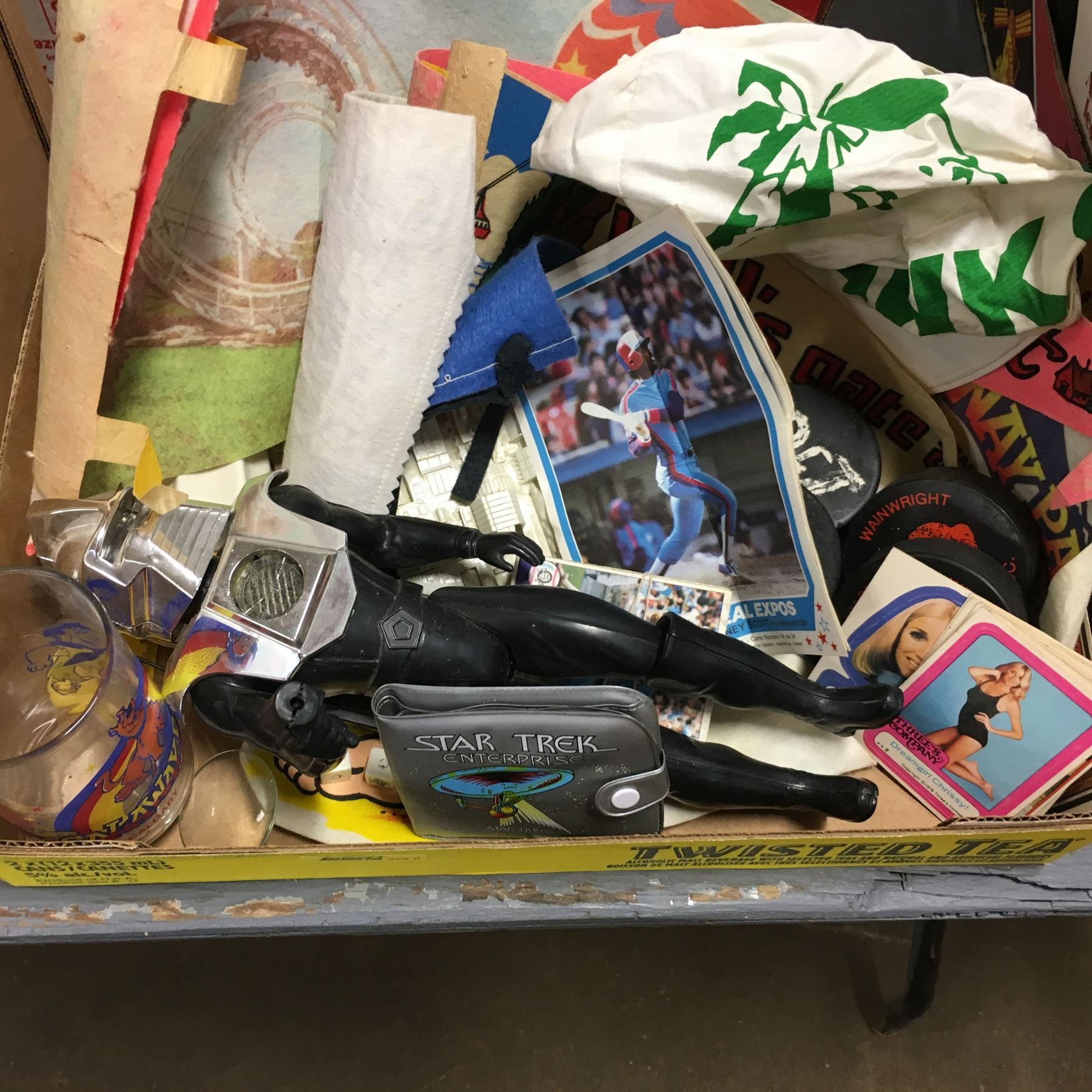 Tray Lot: Retro Pop Culture Memorabilia (Three's Company Trading Cards, Battle Star Galactica Figurine, Pendants, Star Trek Wallet, etc !) MUST LOOK ! WOW !