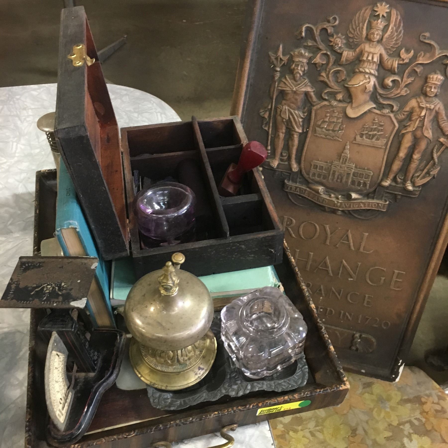 Tray Lot: Scale, Jewelry Box; Ink Well, Desk Bell, Royal Exchange Assurance Plaster Cast Plaque, etc