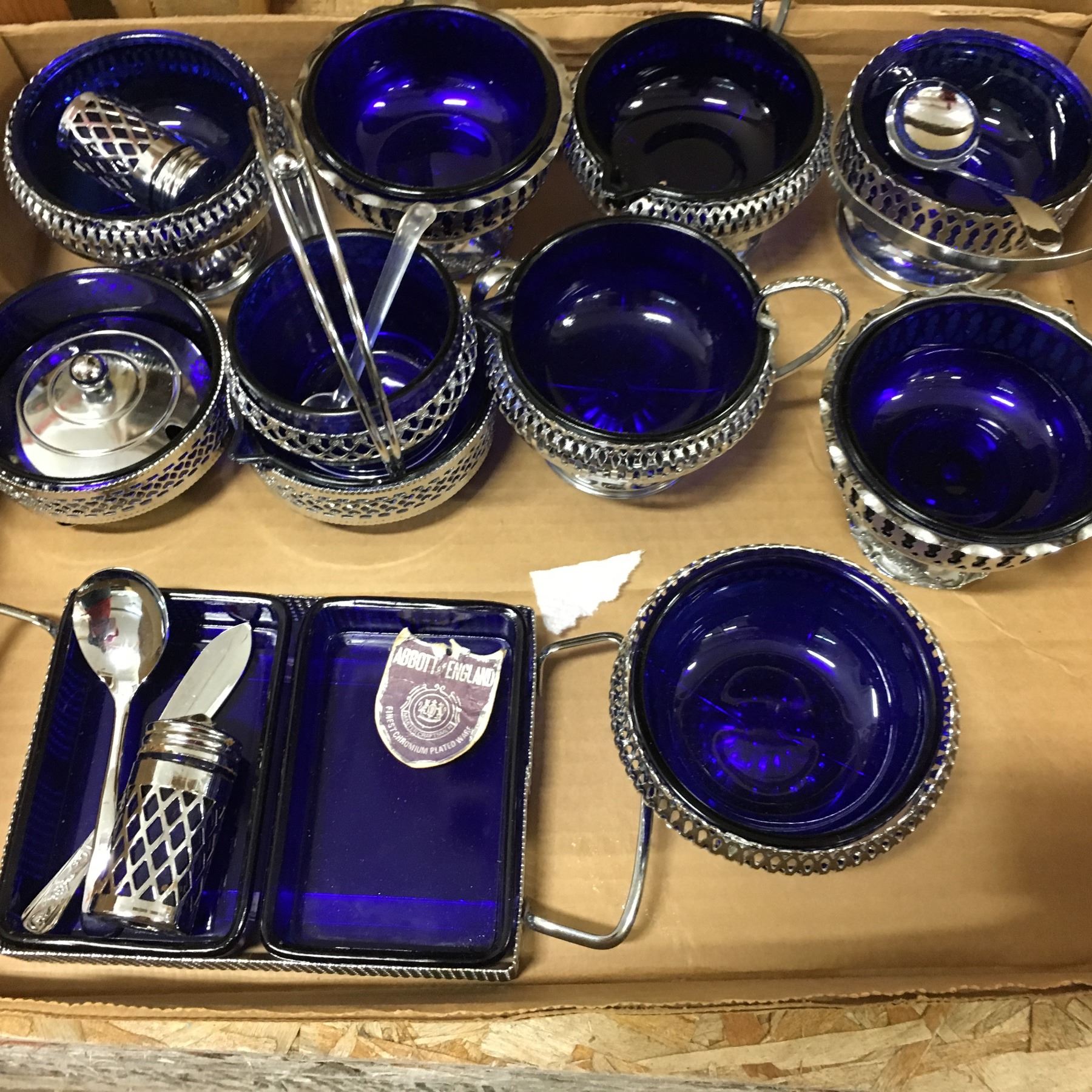 Tray Lot: Silver Lined Cobalt Blue Serving Set
