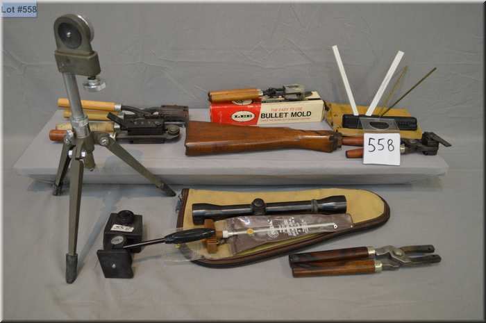 Tray Lot : Spyderco Triangle Knife Sharpener in case - Bushnell Tripod - Redfield Window Mount attachment - Old Weaver Scope ( broken lense but appears to have cross hairs ) - Enfield Butt Stock - 4 bullet molds w/handles - extra set of handles -