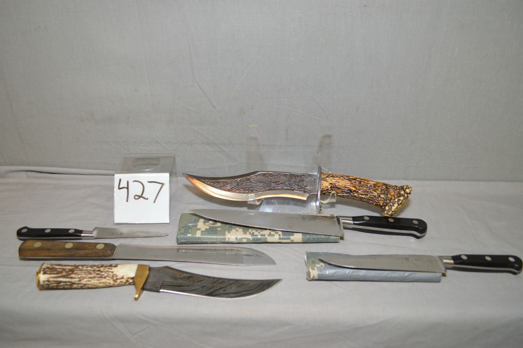 Tray Lot : Three Henckel Kitchen Knives, Unknown Damascus Hunting Knife w/leather case - Winchester Kitchen Knife - Stainless Hunting Knife w/horn style handle & Eagles decoration on blade