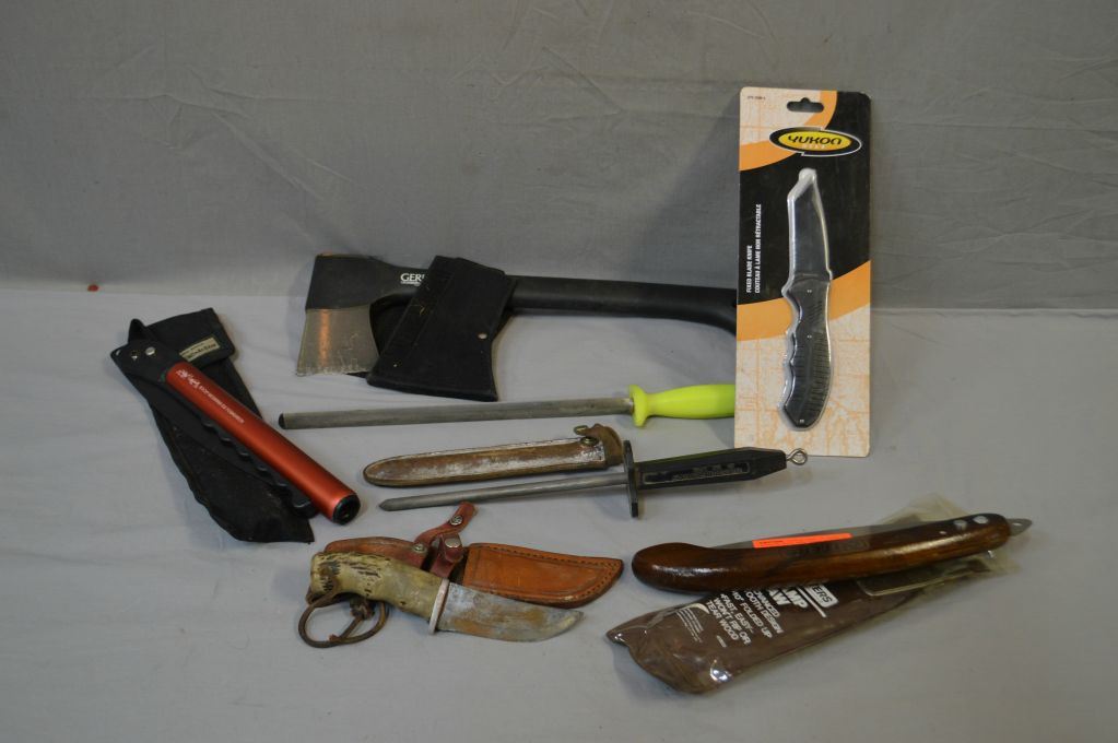 Tray Lot : Trailblazer Extend - A - Saw in nylon case hd marked Rocky Mountain Elk Foundation - Industrial Diamond Steel in leather case - Outers Camp Saw in orig pkg - Yukon Gear Knife in orig pkg - Hunting Knife w/stag handle w/ leather sheath - Sharpening steel - Gerber Hatchet w/ web case
