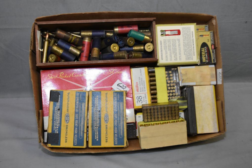 Tray Lot : Two Boxes : Loose Ammo and Shot Shells - Approx Two Boxes Dominion .30 - 06 Cal Ammo - Box .12 Ga - Various Boxes of .22 Cal Ammo - .38 Spec Cal Pistol Ammo etc.