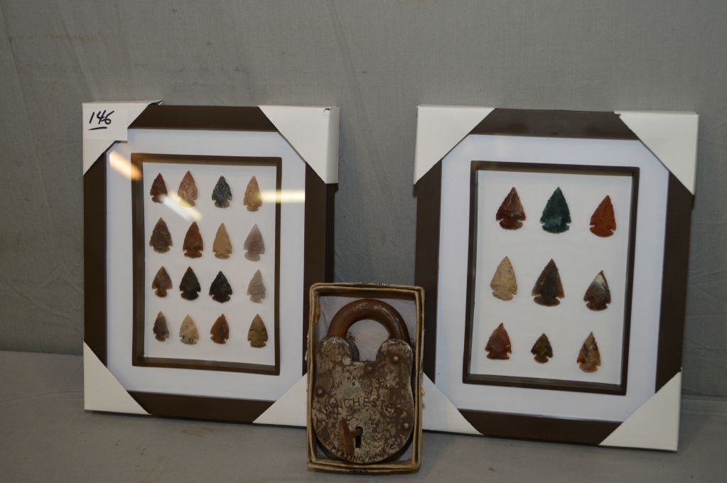 Tray Lot : Two Small Framed Collection of Indian Arrow Heads - Reproduction Winchester Pad Lock