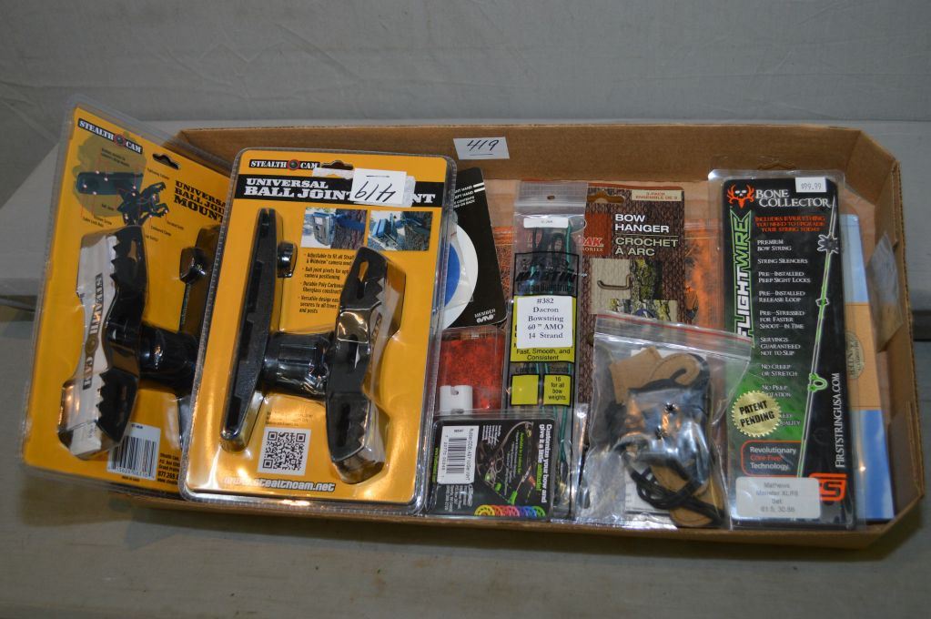 Tray Lot : Two - Stealth Cam Universal Ball Joint Mount New in orig pkg - Bone Collector Flight Wire Mathews Monster XLR8 New in Pkg $ 99.00 - Mossy Oak Hunting Accesory Bow Hanger - Mathews Solocam Custom Damping Access - Dacron Bowstring 60" AMO 14 Strand - PSE White Cable Slide N.In Pkg - BPE Bow Sigh Level - The Complete Bowhunter's Guide to Accurate Shooting etc.