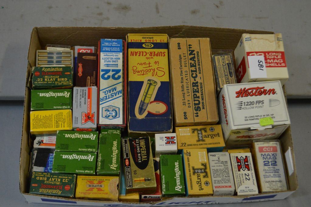 Tray Lot : Various .22 Cal Ammo including some .22 Win Mag - Mini Mag Shot Shells - some Hollow Point - Two Old Bricks of Super Clean - some Peter's Shot - etc.