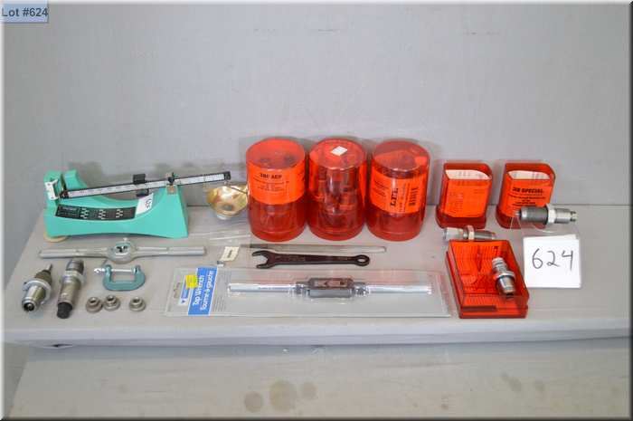 Tray Lot : Various Lee Dies, etc - RCBS 505 scale - Tap wrench - & other tools