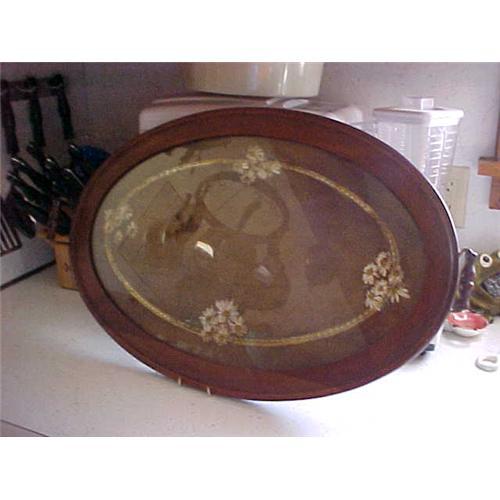 Tray, Large Oval--Wallnut Wood frame; raised brass and wood handles, wood back; 16" X 24"; good condition (c) 1920's - 30's; deco; glass over flowers.