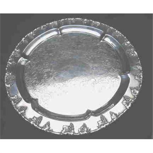 Fabulous Heavy (4lb) round grape decorated tray. Marked Sheffield Reproduction and bearing the Lion and Unicorn each side of a shield. 18inches across. No wear to plate.