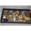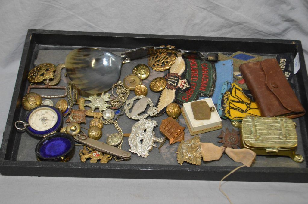 Tray lot of collectibles including vintage brass uniform buttons, military badges and coat patches, small cased barometer, carved tortoise shell spoon etc.