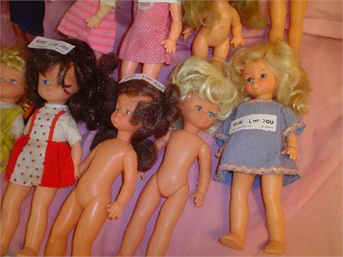 Tray of 18 Dolls. Plastic/Vinyl. Most have Painted Eyes. Some clothed/some unclothed. Marked: Playmates, Hong Kong, 753 (2 are missing an arm)