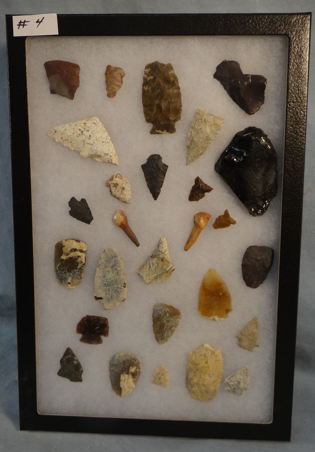 Tray of 25 artifacts, 7 scrapers, 15 arrowheads, 2 knives, 1 drill, 12"x 8", Sun River, MT