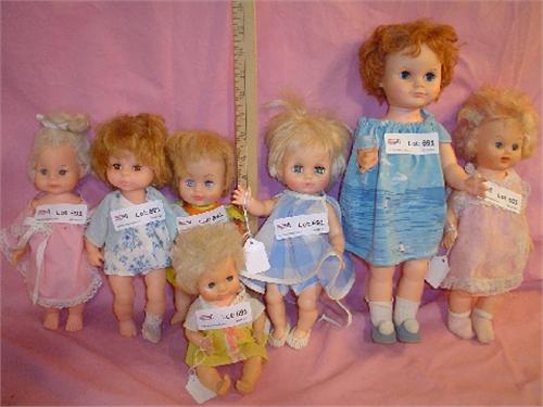 Tray of 7 Dolls: Plastic/Vinyl. All have working/moveable eyes. 1)Blue Sailboat Dress. Back of Head says Uneeda Doll Co. Inc. NE. 2)Blue/White Checked Dress. Back of Head says Vogue 1975. 3)Blue/White Flowered Dress. Back of Head says Lorrie Doll 1971-Made in Taiwan-13. Back says Lorrie Doll 1971-Made in Taiwan. 4)Pink Dress/Pink Hair. Back of Head says AE1105. 5)Pink Dress/White Hair. Back of Head says AE11T-5. 6)Yellow/Orange Flowered Dress (left eye sticks a little). Back of Head says Collette-1054BD-10EYES-Made in Taiwan. Back says 11-Made in Taiwan. 7)Yellow/White Dress. Back of Head says 2481-8EYE-40-Horsman Dolls Inc. G791. Back says Horsman Dolls Inc. BC9