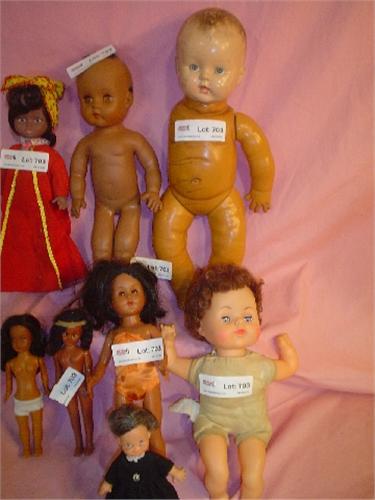 Tray of 8 Dolls: Mostly African Amer. Or Indian. Rubber Stuffed Skin/Vinyl/Rubber/Composition/Cloth Stuffed/Plastic. Some w/moveable eyes (some work/some don't). One is missing the right arm. Marked: Lorrie Dolls-Eugene Doll Co., Hong Kong, Unmarked, 15-T-4, Aces, UD Co. Inc.