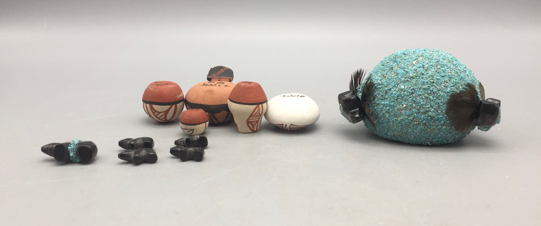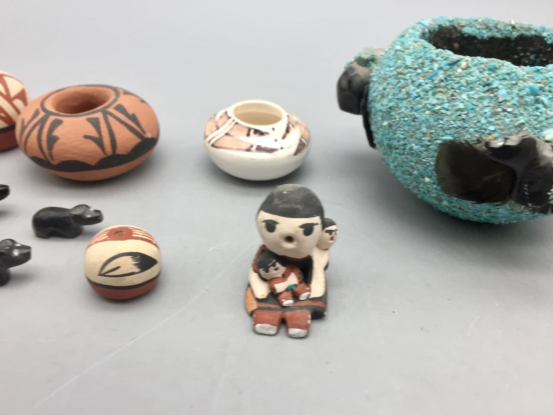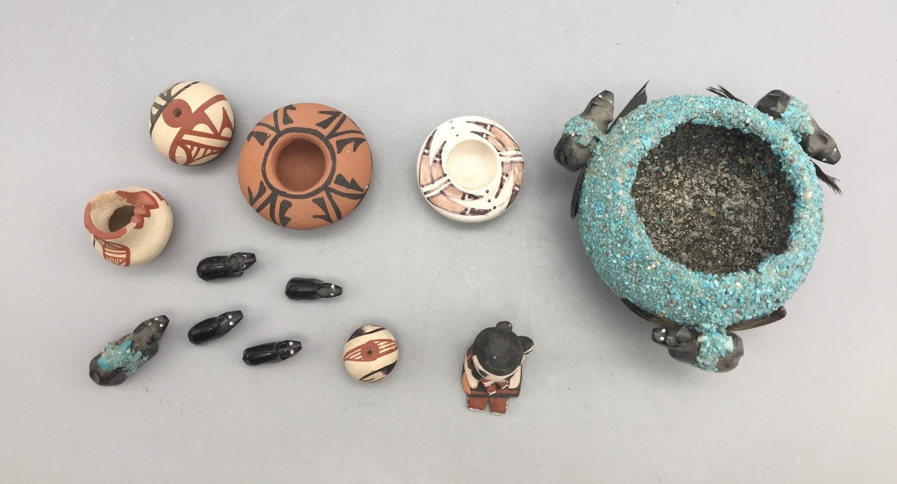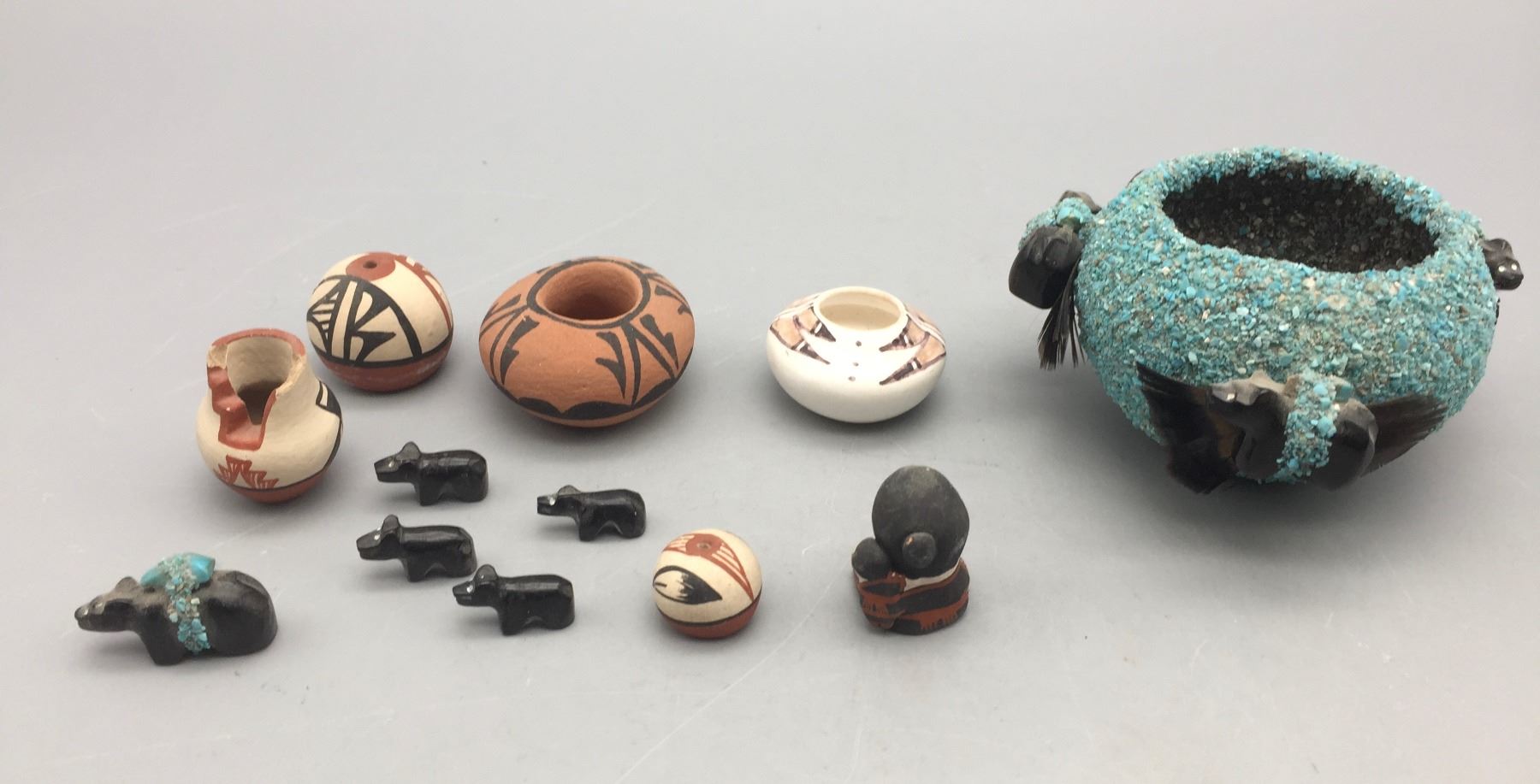 Description: Presented for sale in this lot is a group of mini pottery pieces and fetishes in varying sizes and styles. Maker: Various. Approx. Age: Vintage. Size: 3-1/4” round x 2-1/8” deep to 3/4” long. Condition: Pretty good for their ages, normal wear expected. Please look closely at the pictures - they are an important part of our description. Shipping: There will be a $10 handling / packaging fee for shipping this lot. The actual cost of postage will be added on top of that.