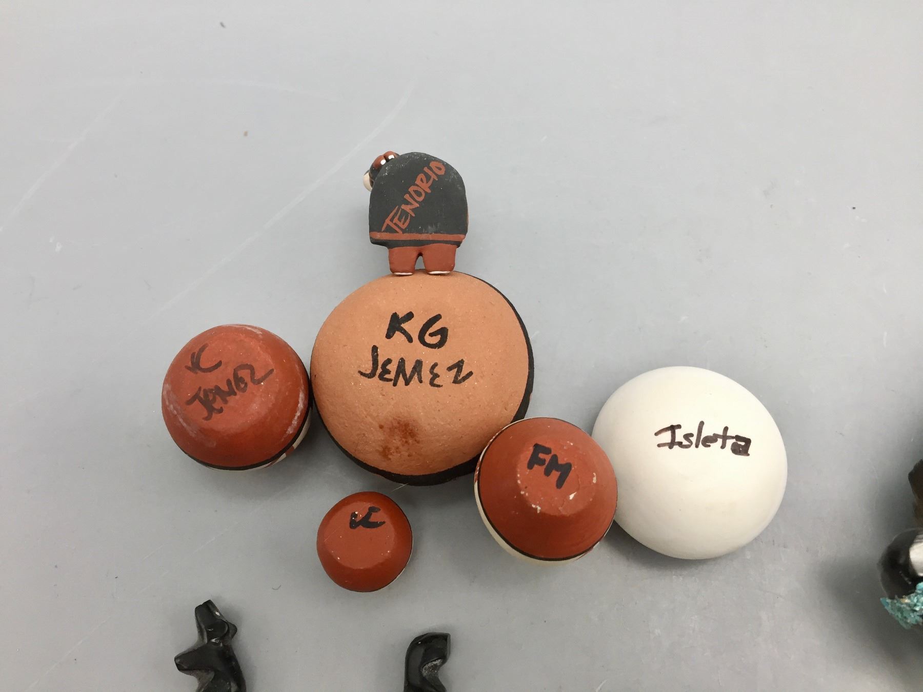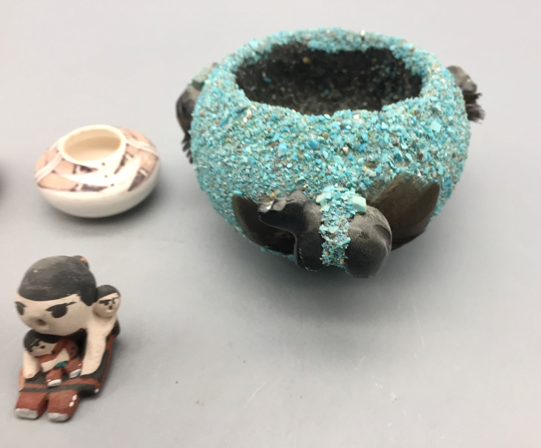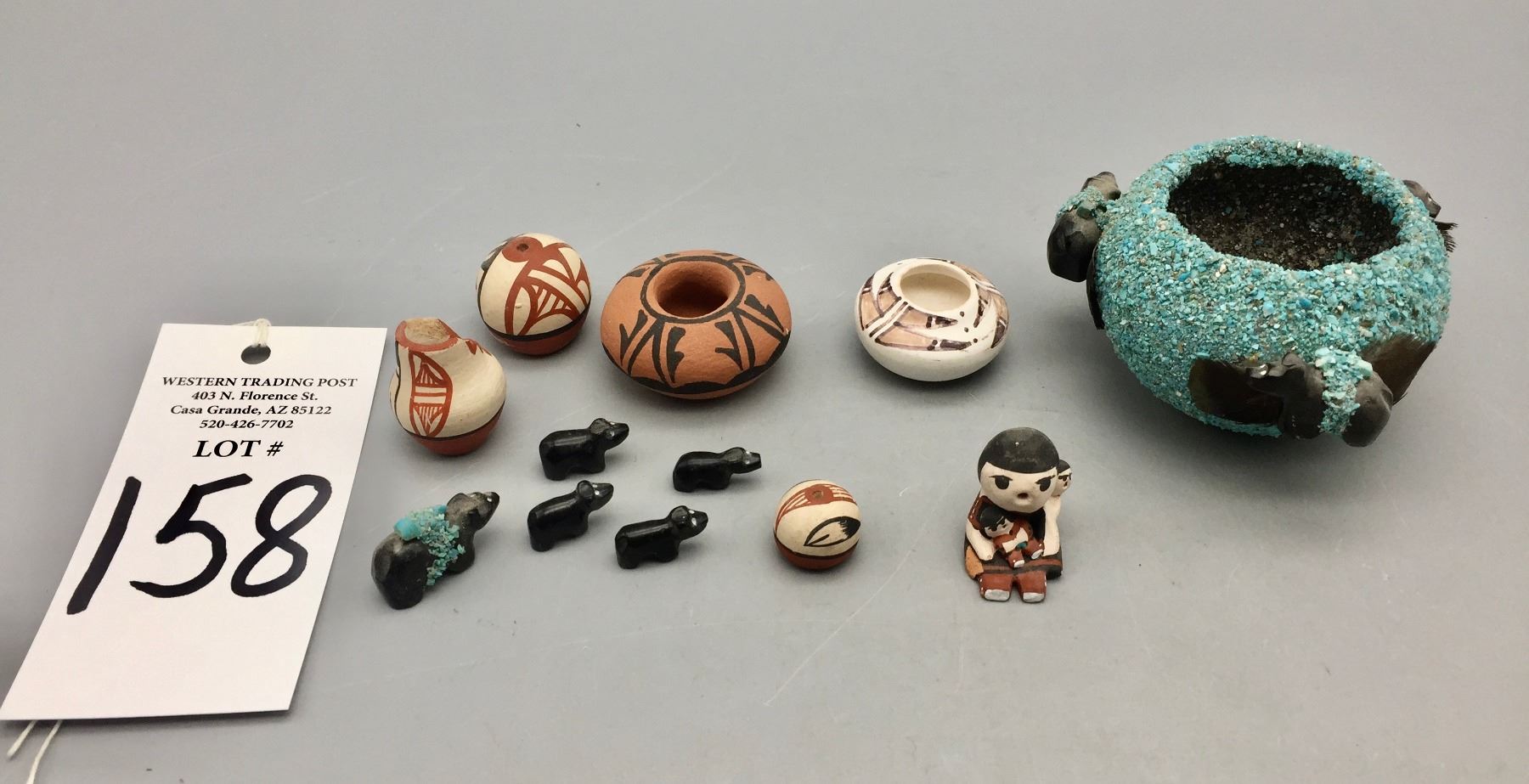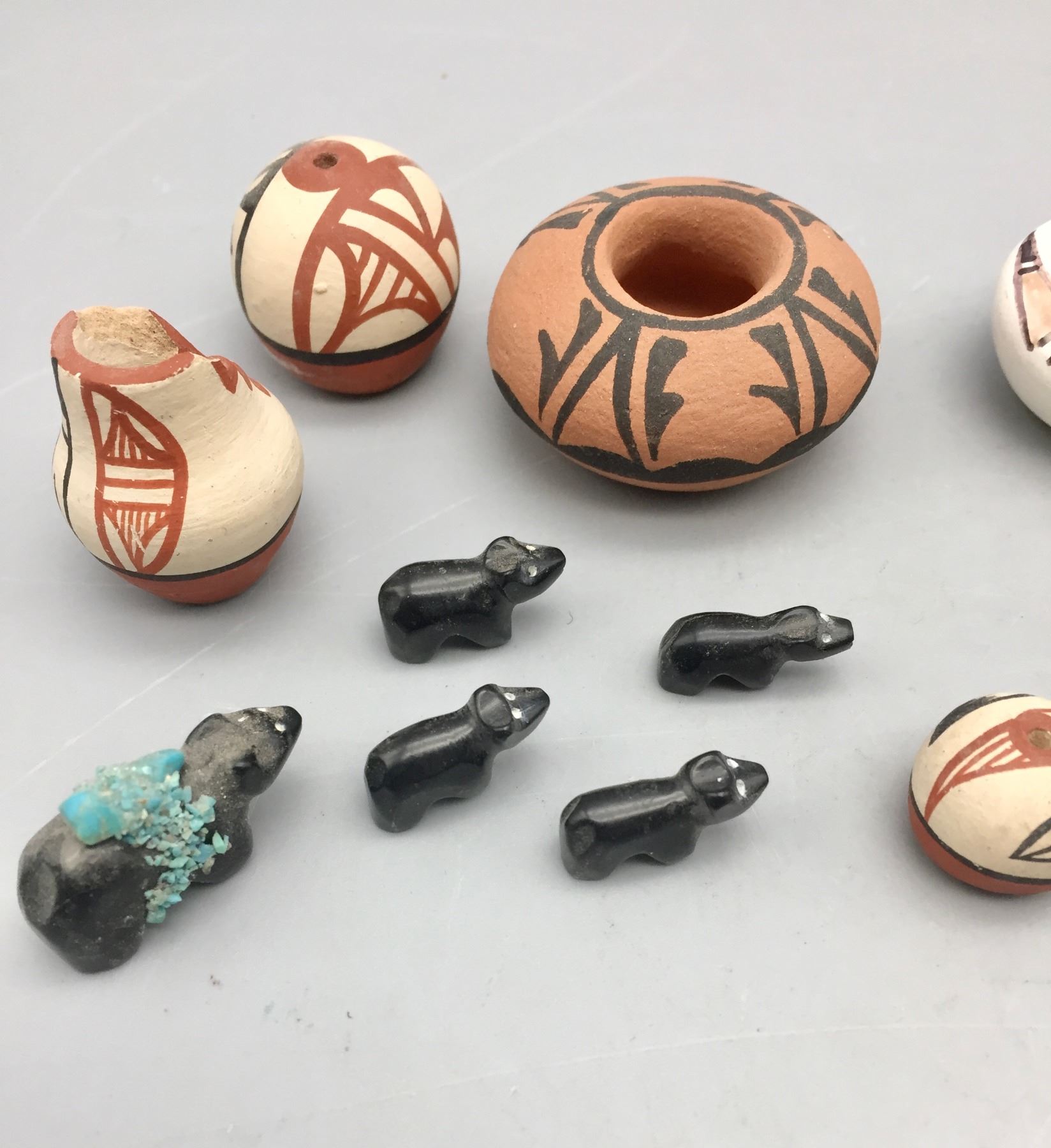 Description: Presented for sale in this lot is a group of mini pottery pieces and fetishes in varying sizes and styles. Maker: Various. Approx. Age: Vintage. Size: 3-1/4” round x 2-1/8” deep to 3/4” long. Condition: Pretty good for their ages, normal wear expected. Please look closely at the pictures - they are an important part of our description. Shipping: There will be a $10 handling / packaging fee for shipping this lot. The actual cost of postage will be added on top of that.