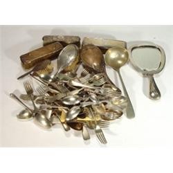 Tray of assorted silver plated cutlery, silver backed Art Nouveau brushes, ladles etc.