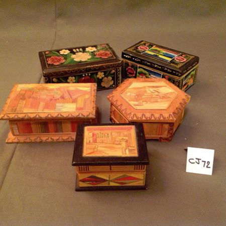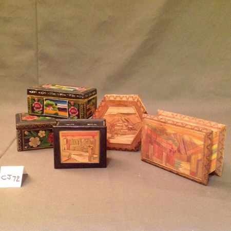 Mid 1900s, From Mexico, includes two lacquered wood boxes and three "straw art" wood boxes. From Guerrero, Mexico. Good condition. Largest 6-1/2" x 4-1/2"