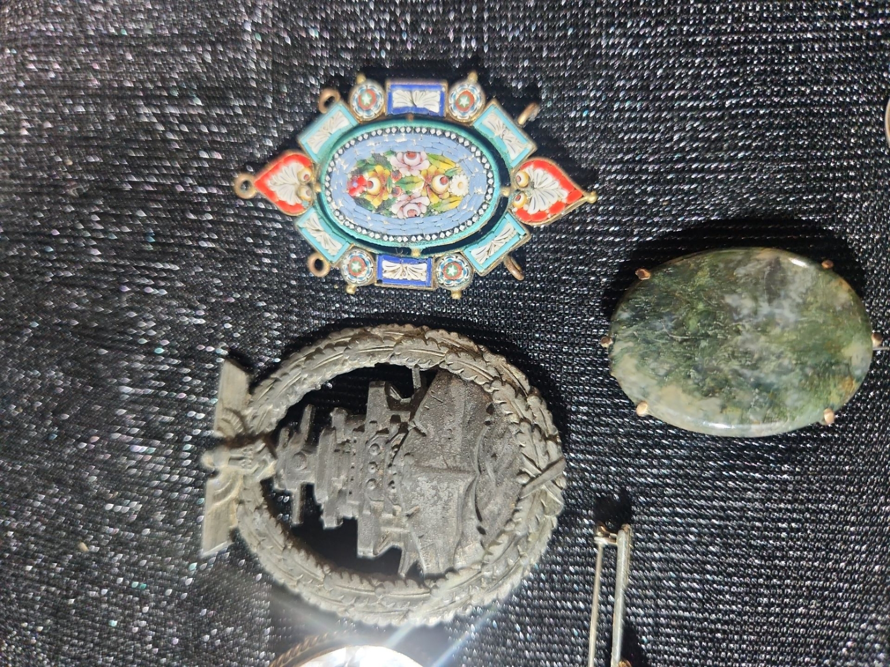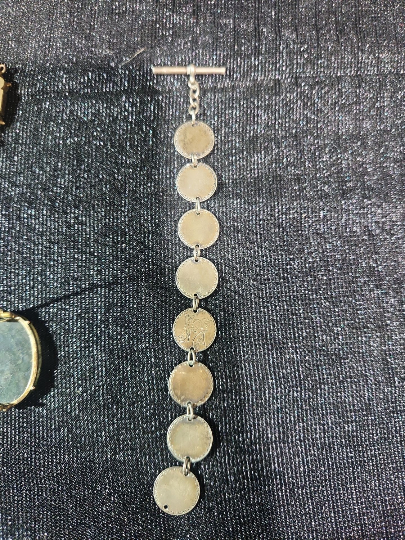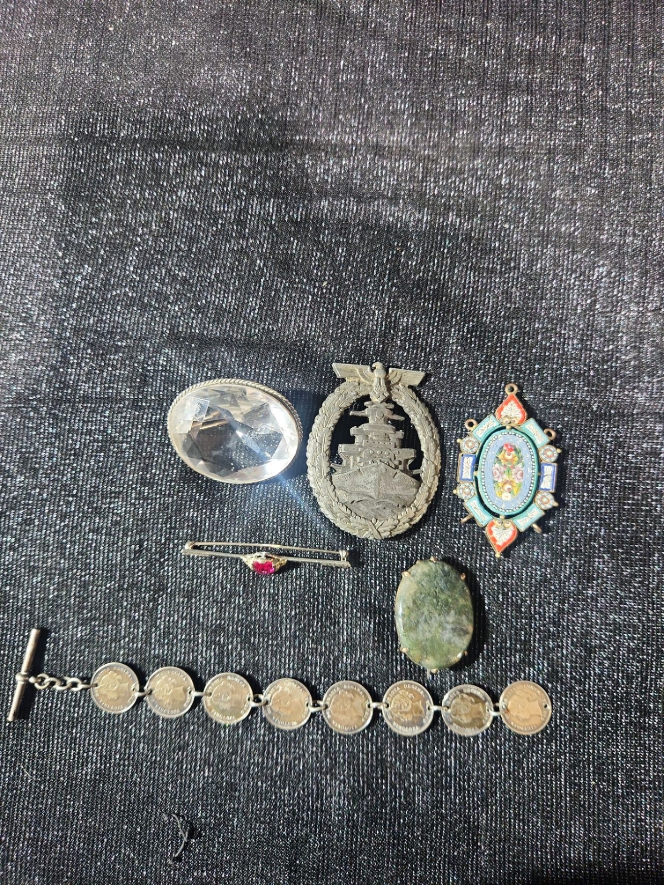This little treasure case is filled with some beautiful brooches, a coin bracelet ( missing attaching hardware) and a beautiful floral charm. The military pin is from Berlin , World War times.
