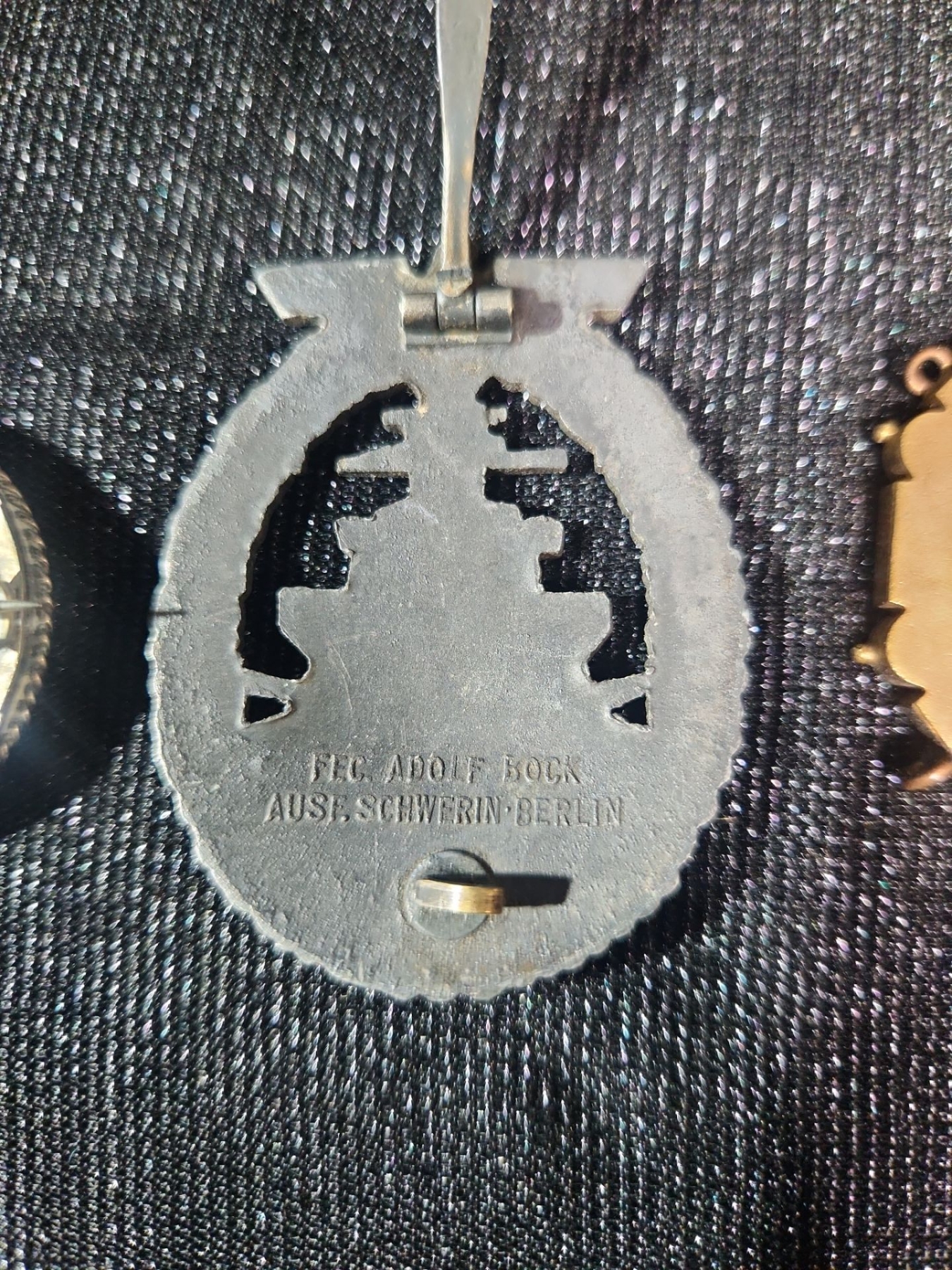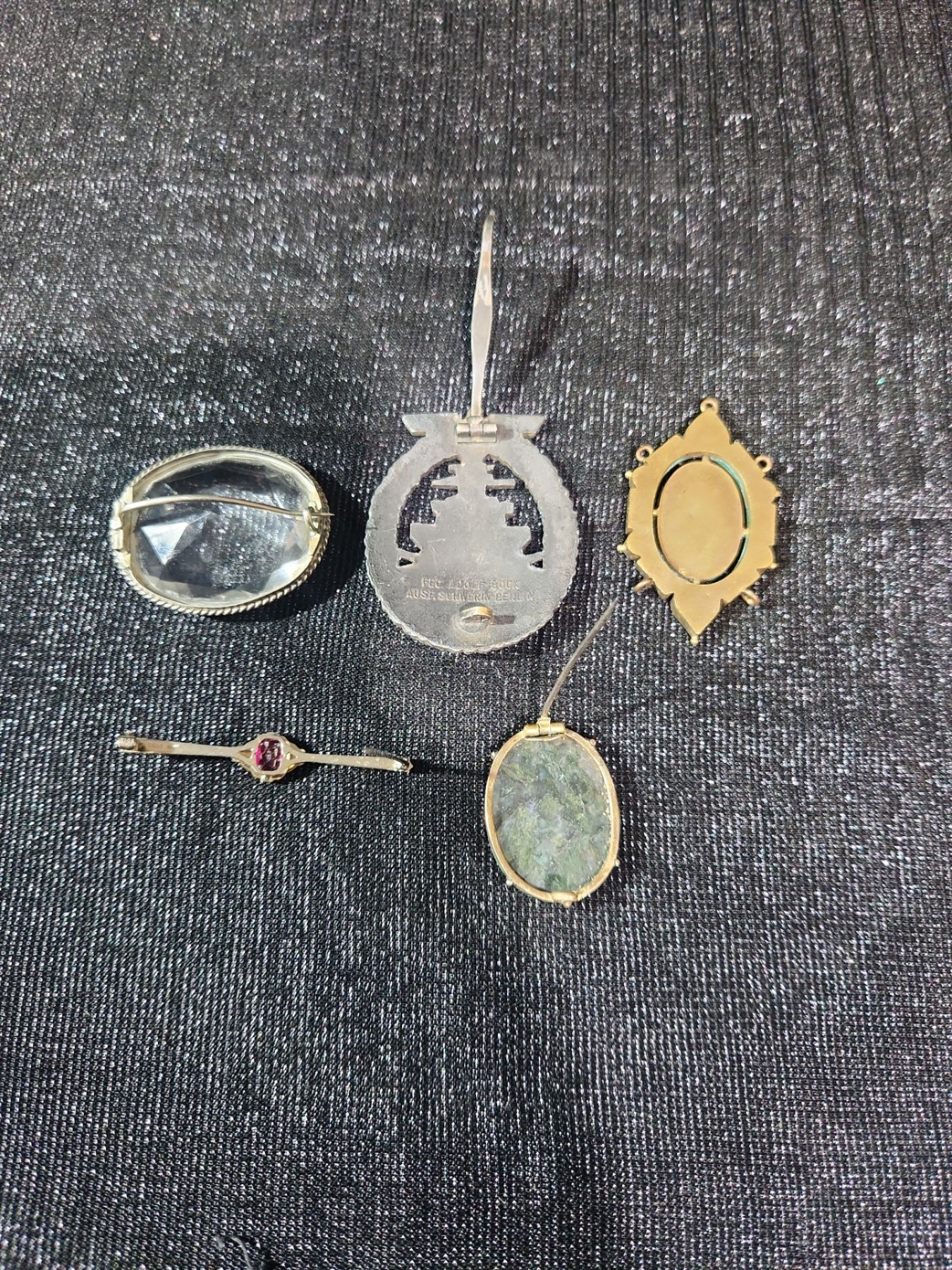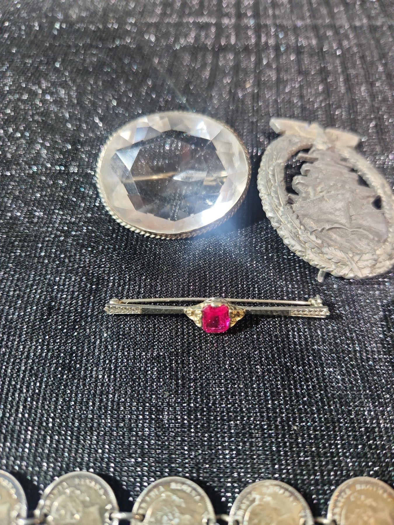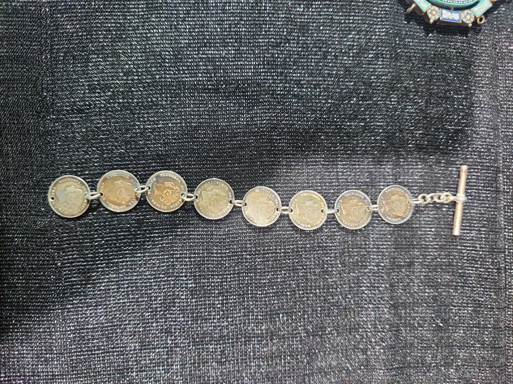 This little treasure case is filled with some beautiful brooches, a coin bracelet ( missing attaching hardware) and a beautiful floral charm. The military pin is from Berlin , World War times.