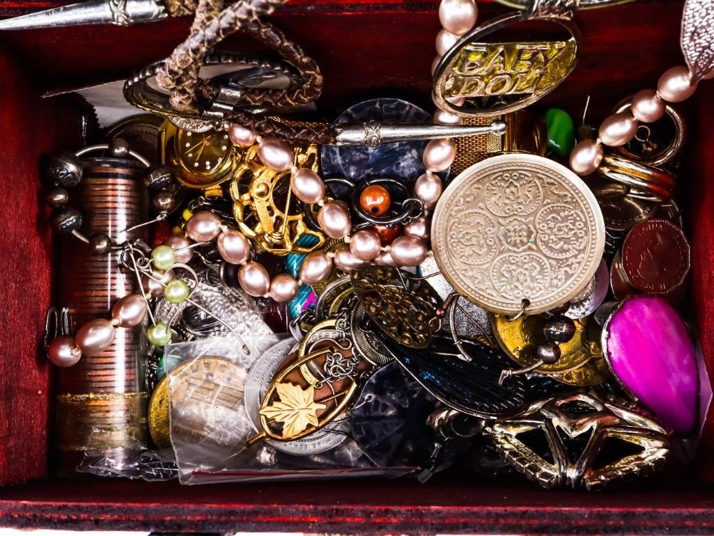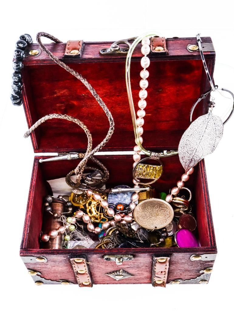Treasure Chest w/ Estate Contents - Jewellery, Coins, Stamp Etc.