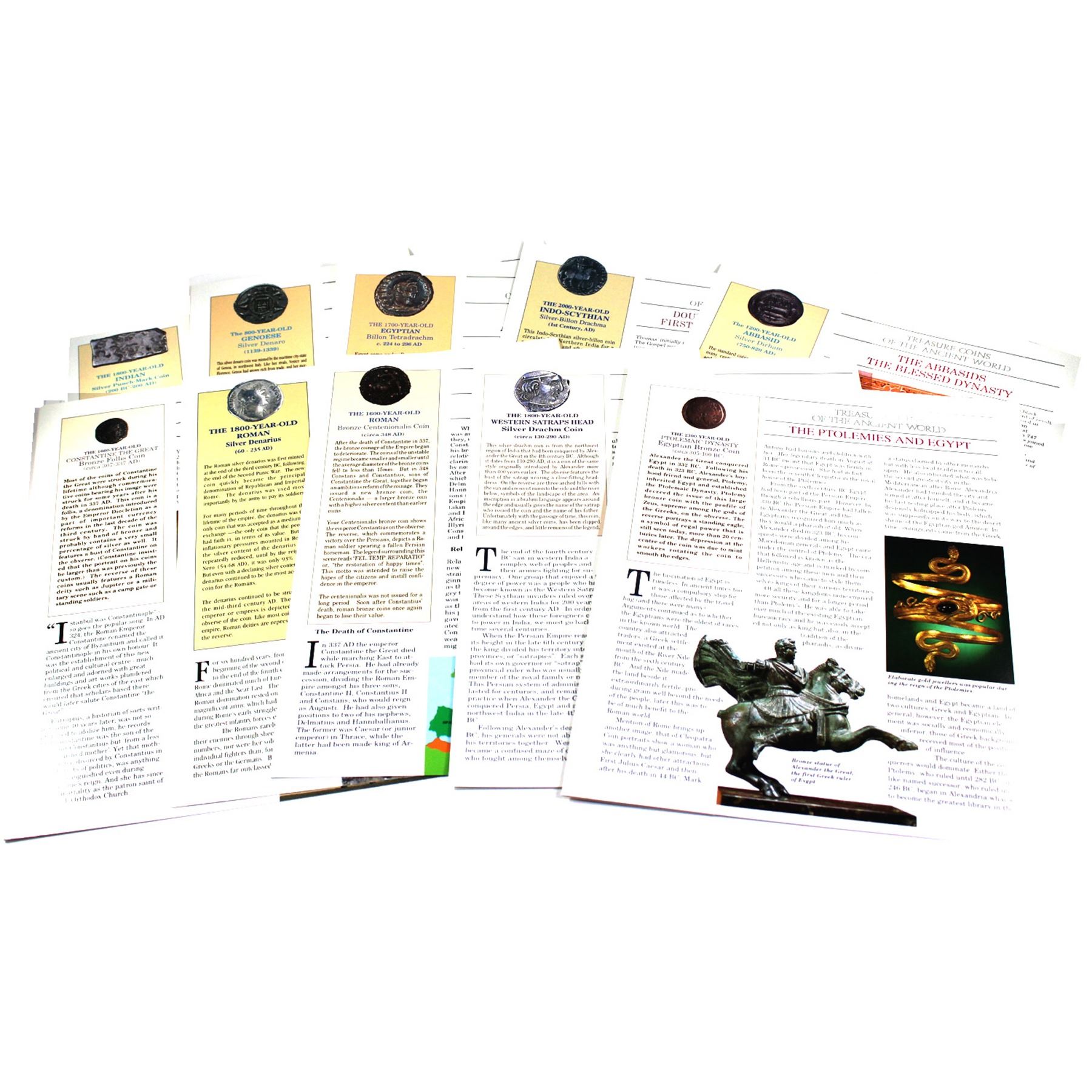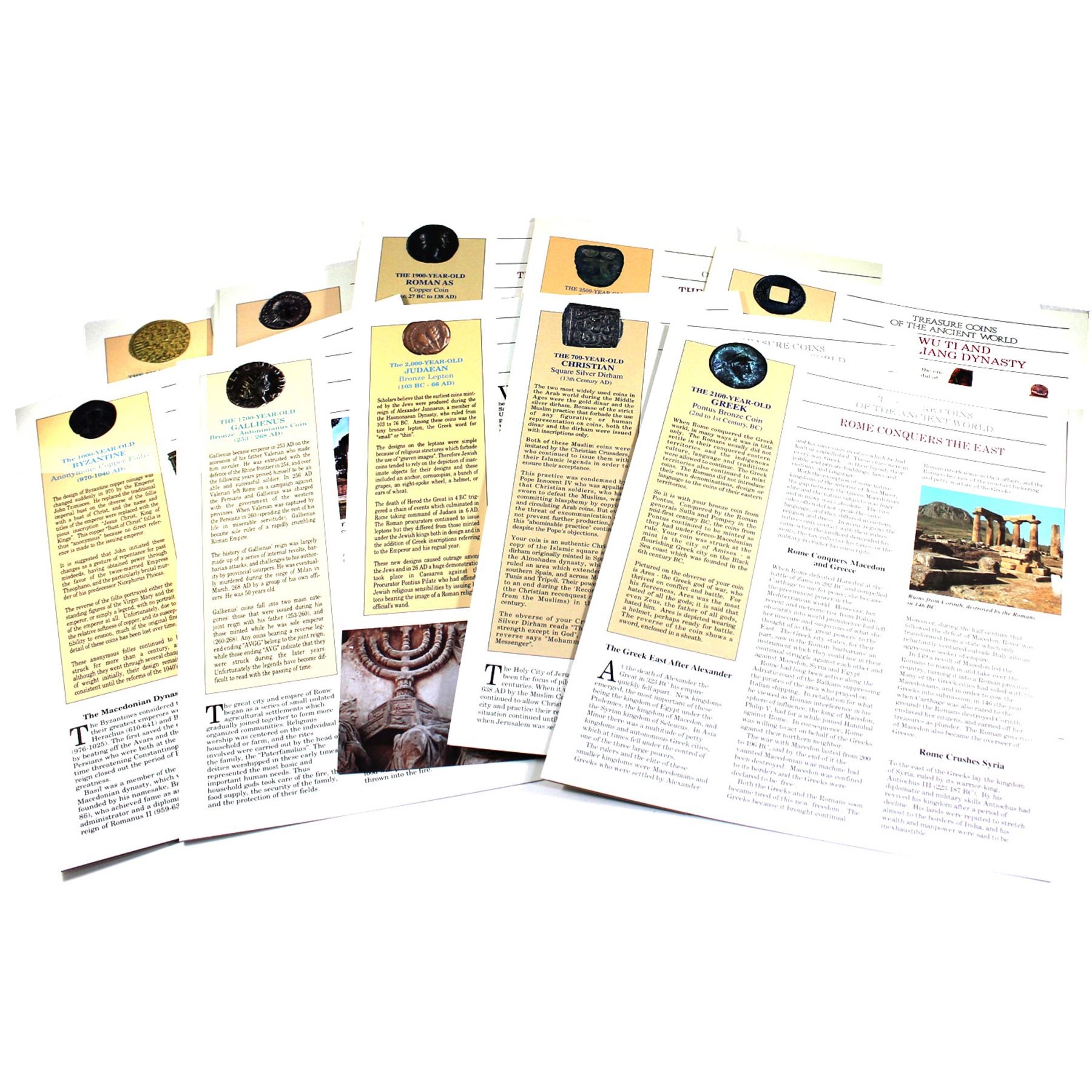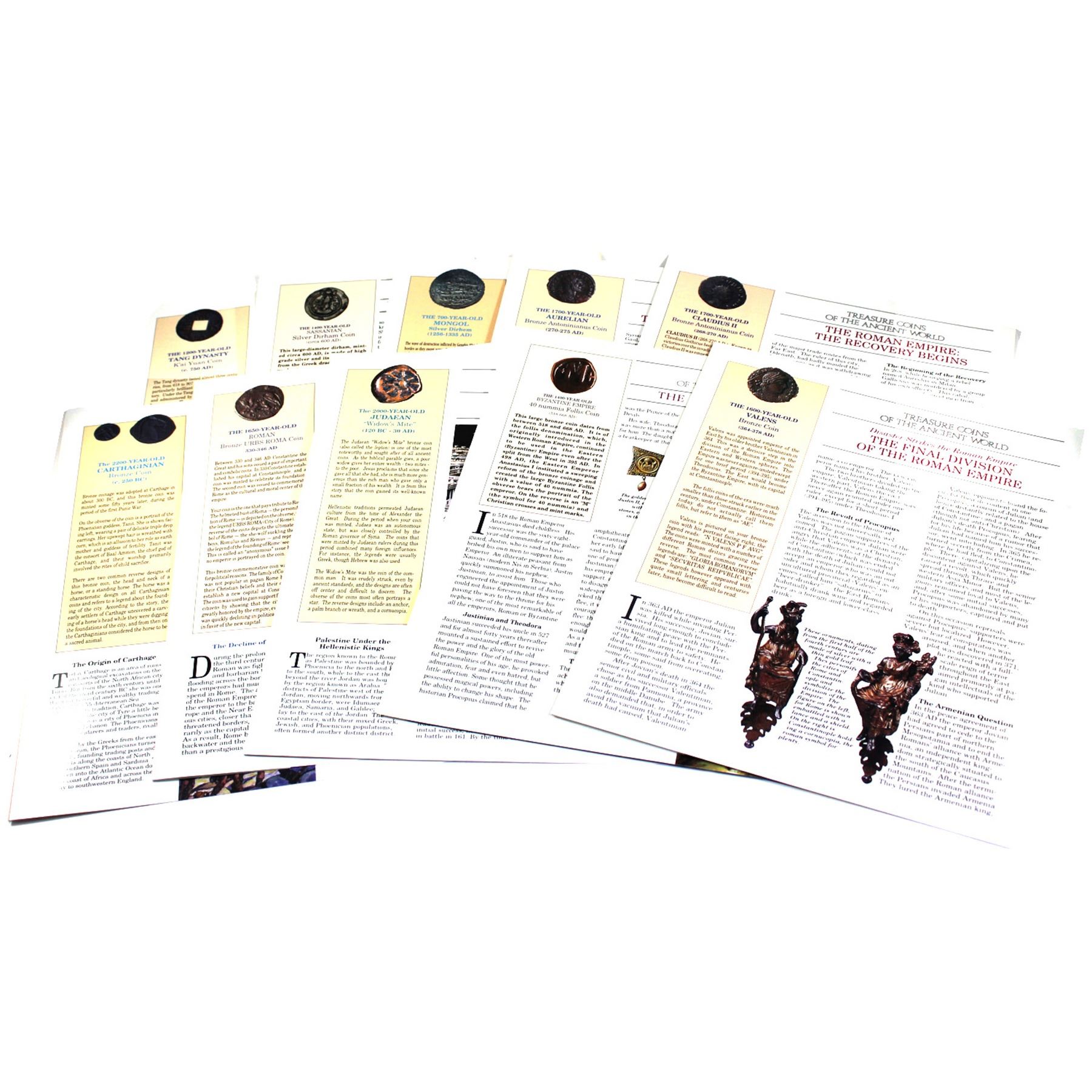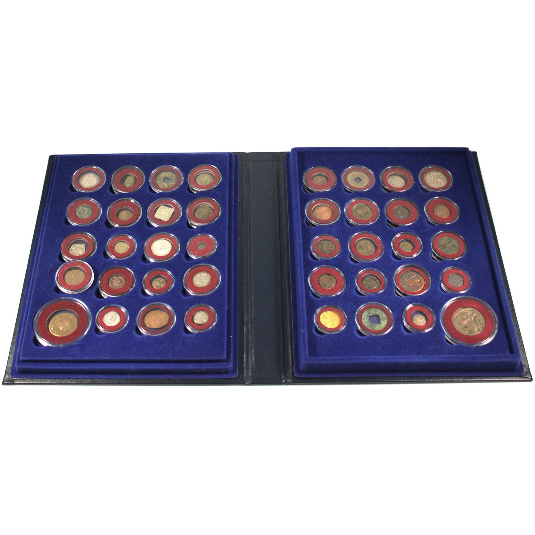 Treasure Coins of the Ancient World 40-coin collection from 300-600 BC to the 1600's! Over 200 years of coins and history, comes with colourized information sheets for all the coins. Coins are encapsulated and displayed in a deluxe book style binder. Set includes 1 Gold Ottoman Ashrafi Altin coin (1473-1695), 10x Silver Strikes, and the remaining Copper/Bronze issues. This impressive set comes in 2 display binders, 1 containing 40 coins, and the other the colourized informational sheets for each coin (Note there is 39 out of 40 sheets- 1 appears to be missing). This is an great conversation pieces sure to amaze any coin enthusiast or "history buff". Don't miss out on this "time capsule" of world coins with a span of nearly 2000 years many coins 1000-2000+ Years Old! (some coins have been cleaned or restored for presentation purposes)