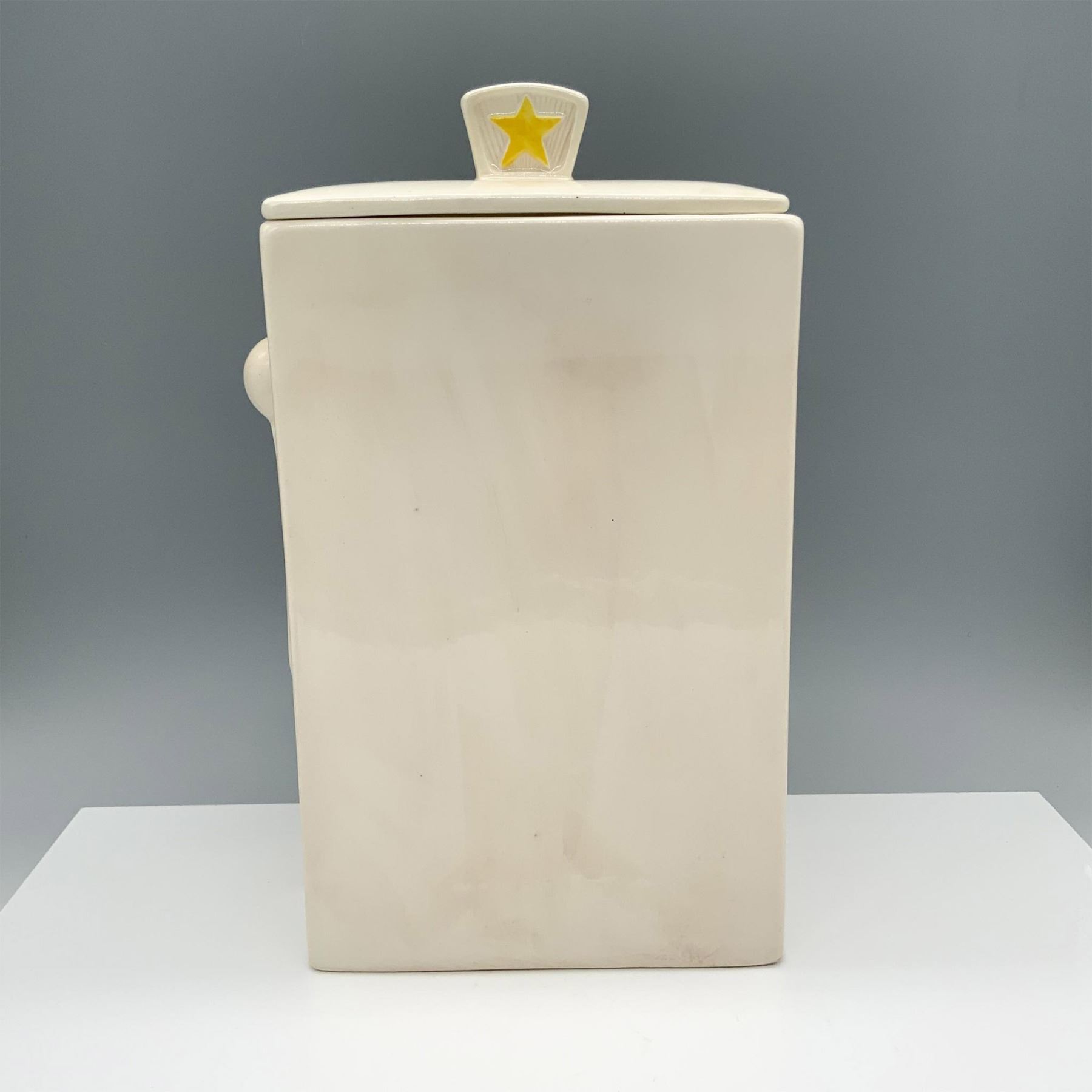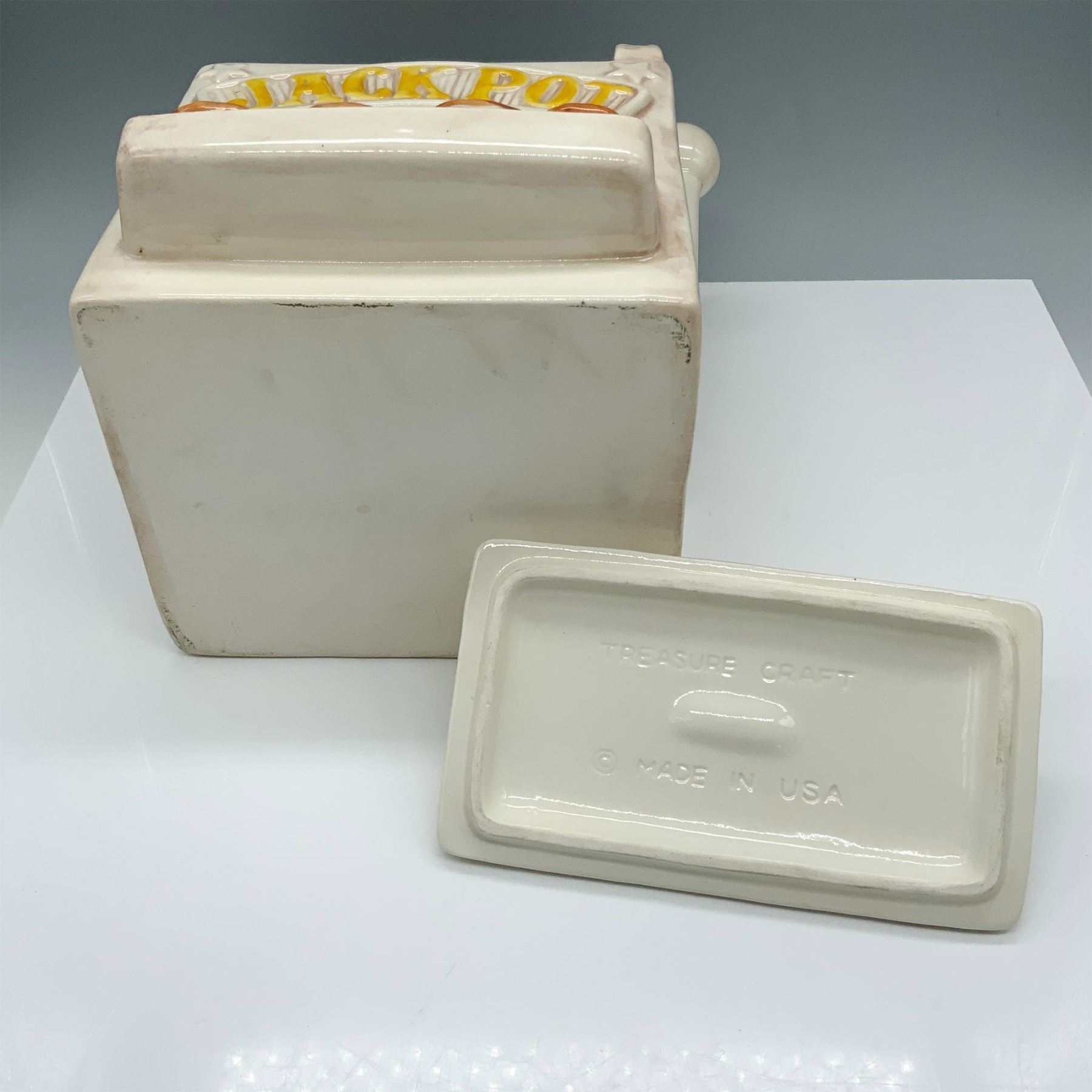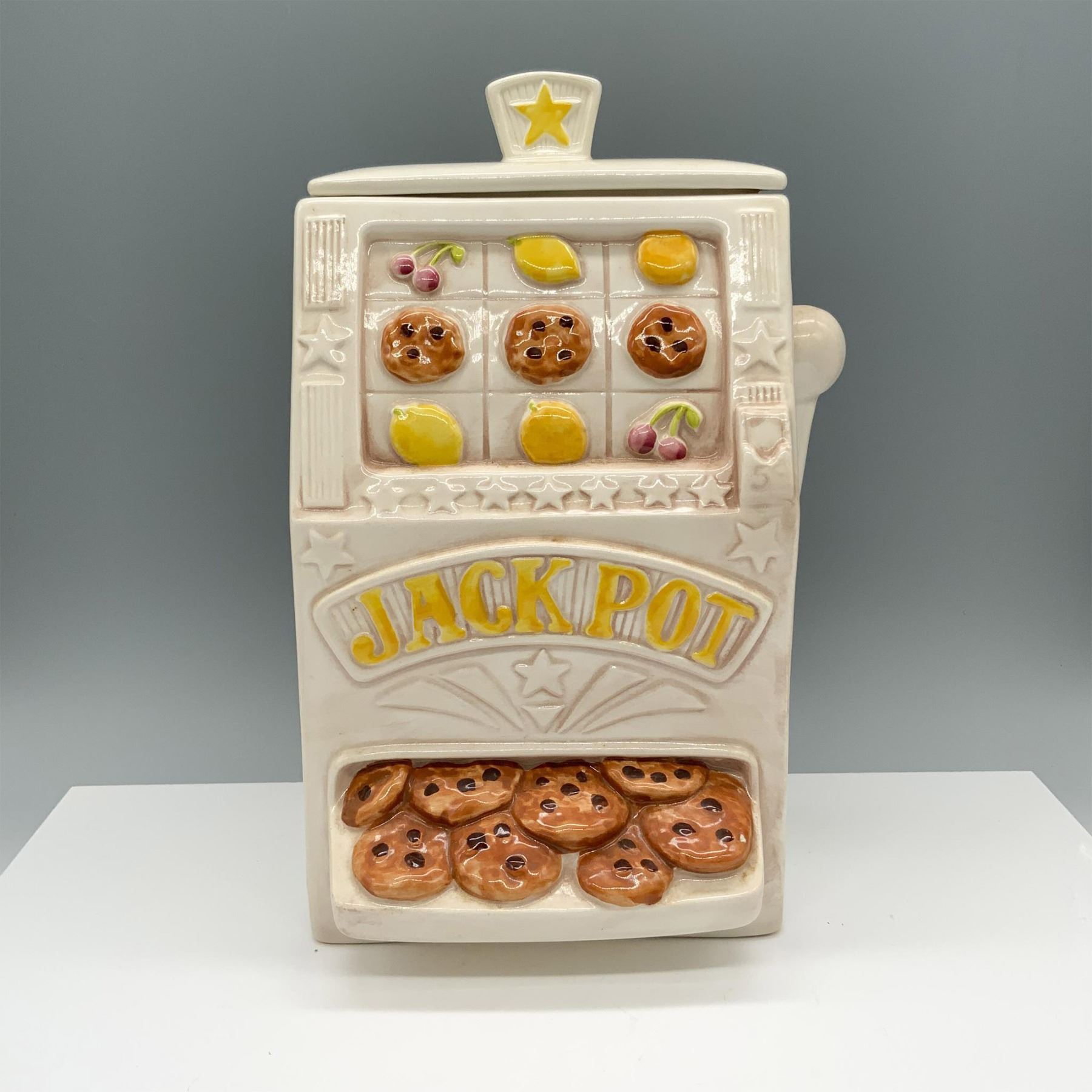 Fantastic and fun porcelain cookie jar with a lid that is decorated as a slot machine that has hit the jackpot and won a bunch of cookies. Treasure Craft Made in USA backstamp.
