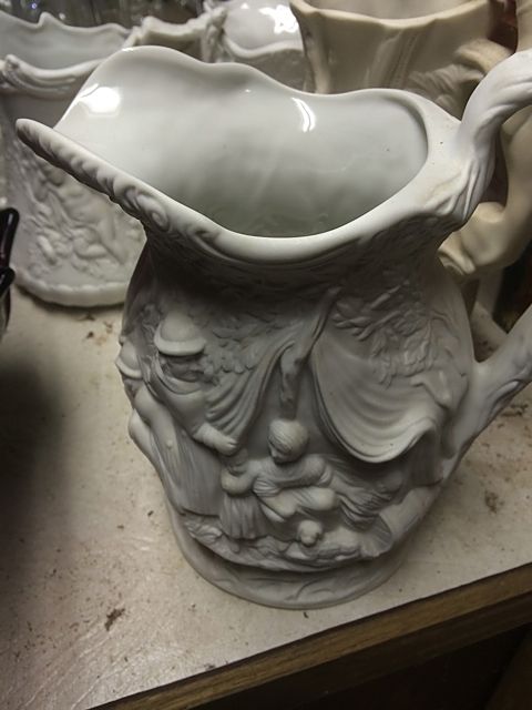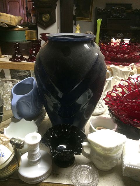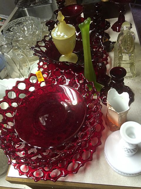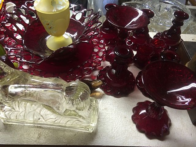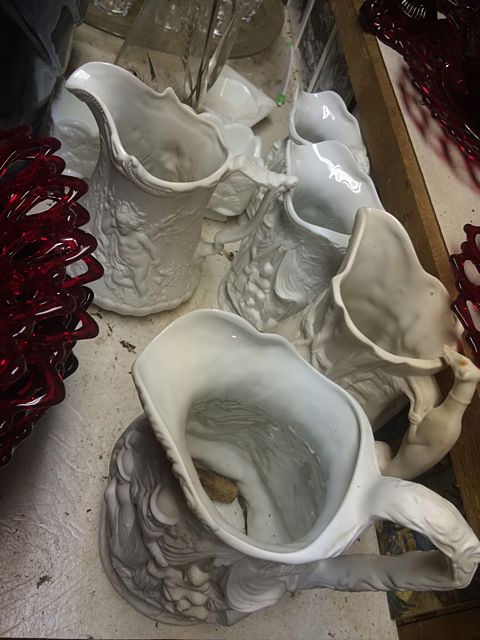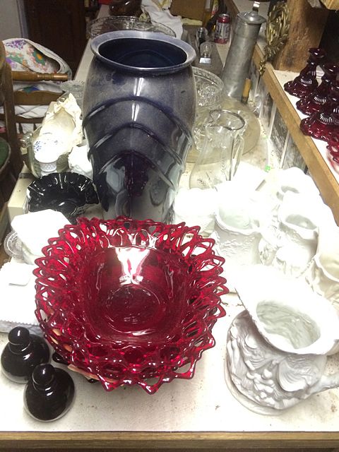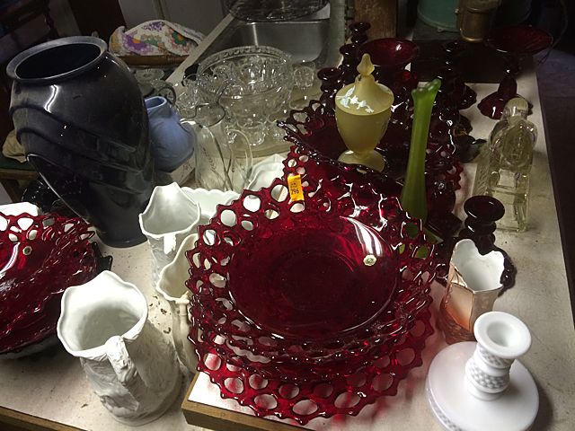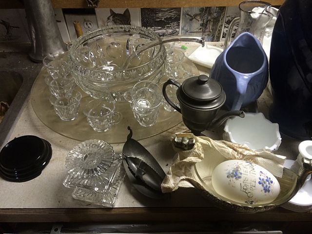 Treasure glass lot includes punch bowl set, pewter items, pitchers, vases, Ruby Glass, Westmoreland glass, porcelain items including collectable pitchers, etc.