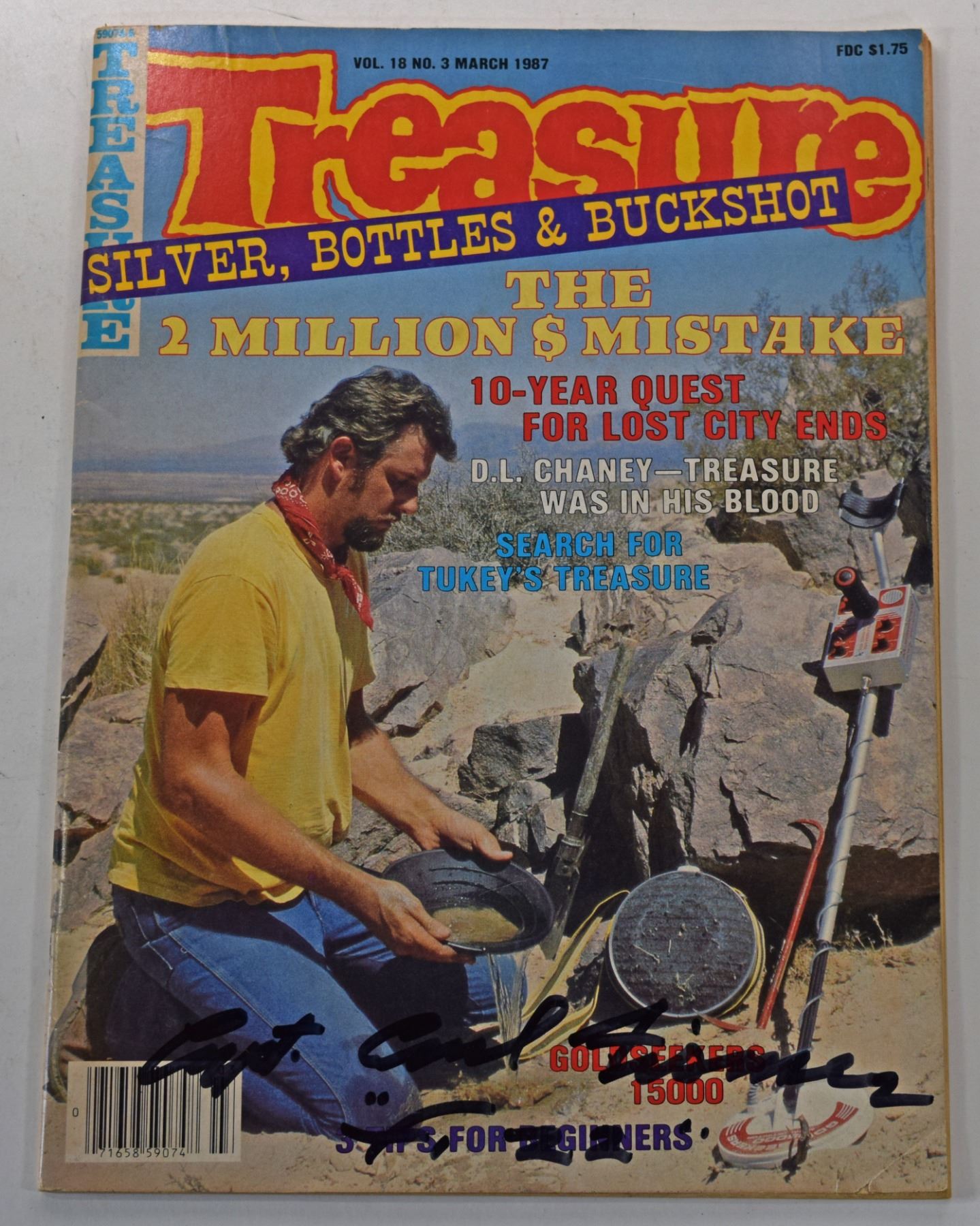 This lot contains the March 1987 issue of the popular treasure hunting magazine, Treasure. It is signed on the cover by well-known treasure hunter, salvor, author and TV personality, Carl Fismer.