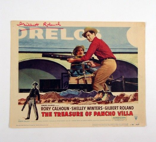 Treasure Of Pancho Villa Gilbert Roland Signed Original Lobby Card One of the many, and also one of the best of the adventure motion pictures extolling the adventures of Pancho Villa and his men. Starring Rory Calhoun, Shelly Winters and Gilbert Roland as Colonel Juan Castro, this 1955 romantic action Western was filmed on location at many of the actual locations. It also is noted as bringing the tune "La Cucaracha" into the American mind-set! This is an original Lobby Card from the feature and is personally signed by Gilbert Roland. Lobby Card is 14"x11".