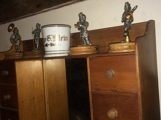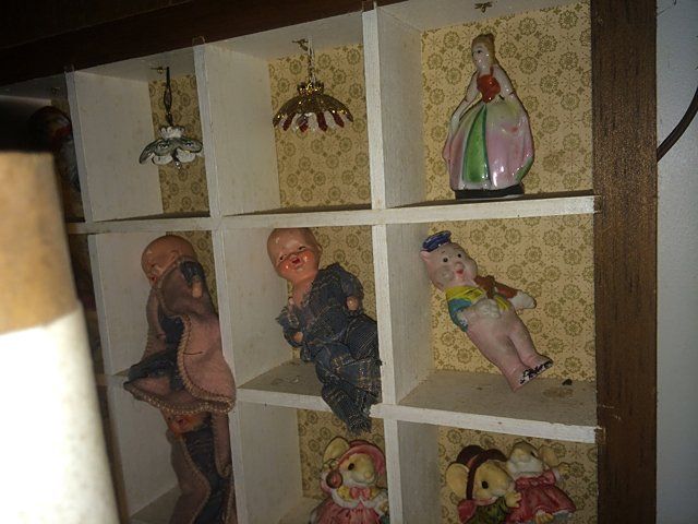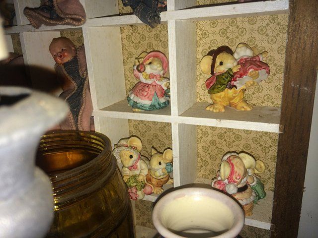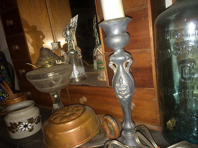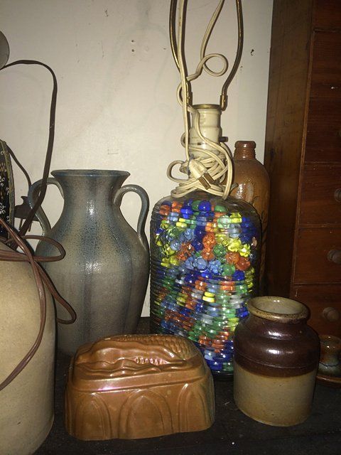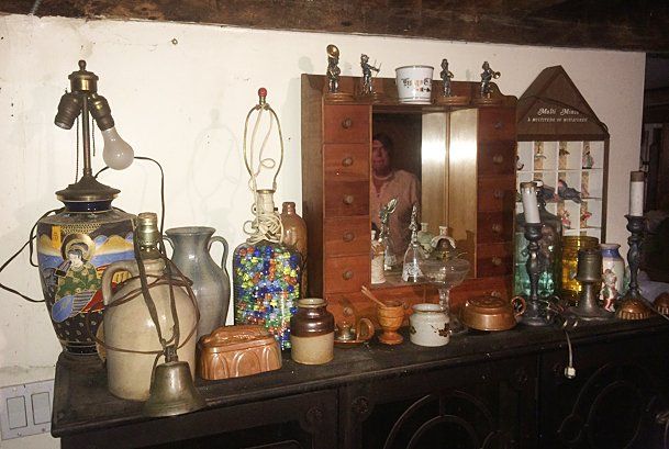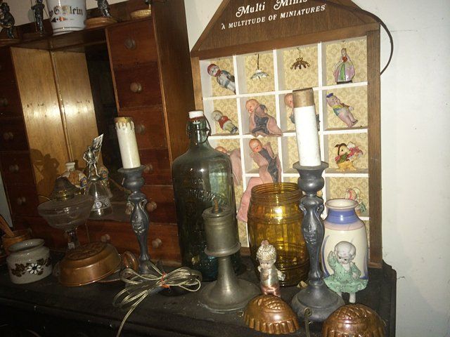 Treasure Trove Lot includes Satsuma lamp, copper molds, porceline figurines, salt glaze pitcher, marlbe lamp, shelf cabinet with mirror, etc.