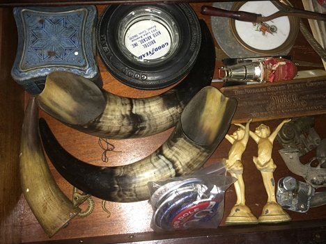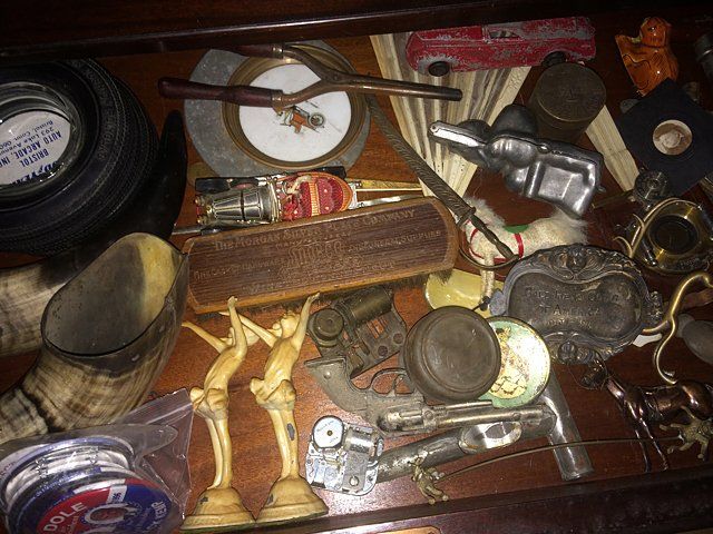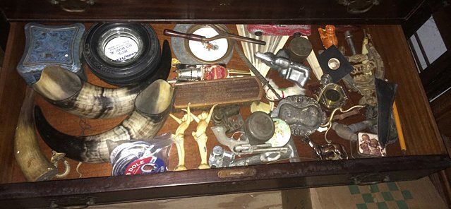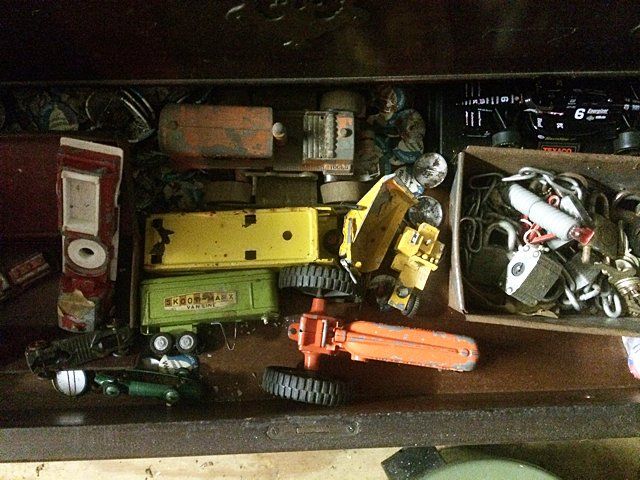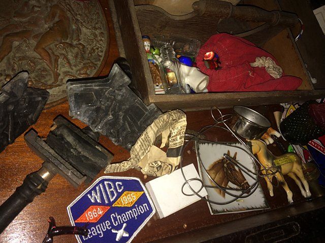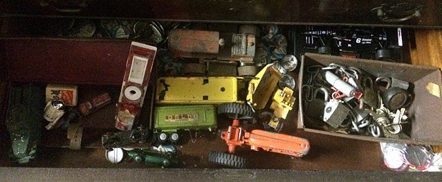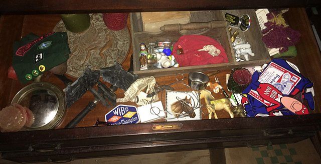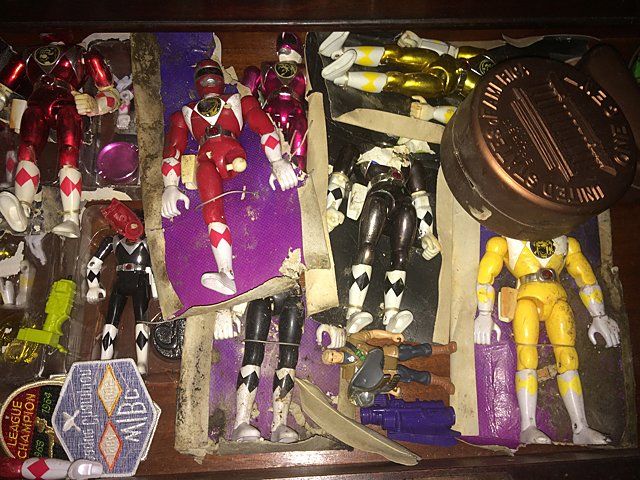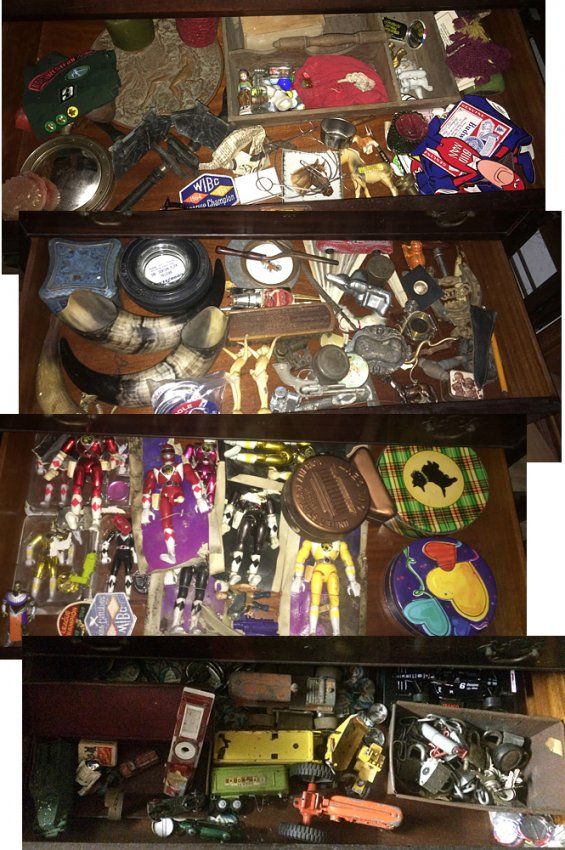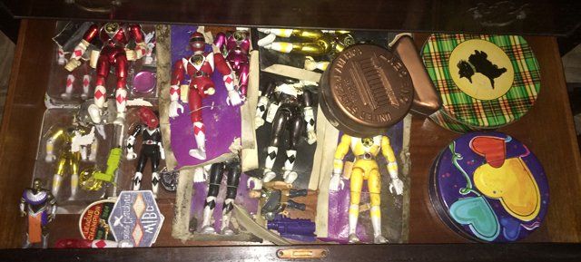 Treasure Trove of 4 Filled Drawers; includes Power Rangers, marbles, lead toy molds, figurines, vintage toy cards, power horns, locks, girl scout banner, Budweiser stickers, tins, and many other treasures to be discovered!