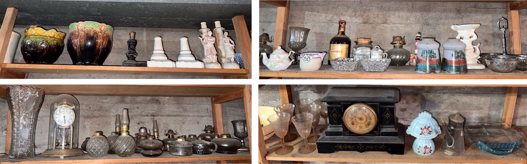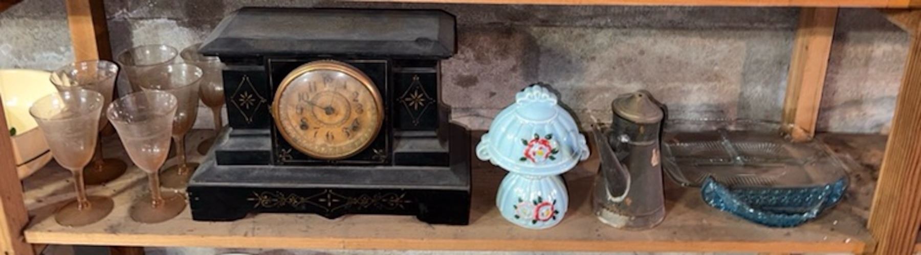 Treasure trove 4 shelves oil lamps, Majolica, Depression glass, shelf clock, from the lifetime collection