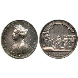 Great Britain, silver medal, Anne, 1704, first grant to Church (Croker). MB2-p251.43. 45mm; 34.8 grams. Obverse with very high relief bust of queen, h