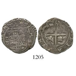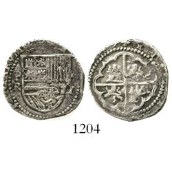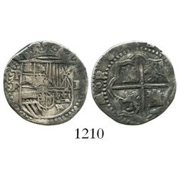 Potosi, Bolivia, cob 1 real, Philip II, assayer R to left (Rincon). S-P1; CT-637. 3.4 grams. Nice full shield and cross (both slightly doubled), tone