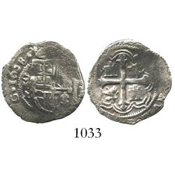 Lima, Peru, cob 2 reales, Philip II, assayer Diego de la Torre, *-ii to left and P-oD to right. S-L4; KM-9; CT-487. 6.6 grams. Good full cross, well-