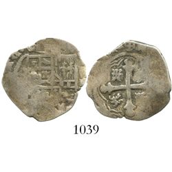 Mexico City, Mexico, cob 1/2 real, Philip III, assayer not visible. 1.6 grams. Choice VF+ on a broad, oblong flan that shows a full and bold king...