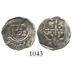Lima, Peru, 1/4 real, Philip II, assayer Rincon, legends ending in HI- and -RVM, very rare. S-L1. 0.5 gram. Full crowned R and crowned I with assayer