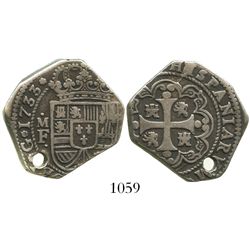 Mexico City, Mexico, klippe 8 reales, 1733MF, with Guatemala sun-over-mountains countermark (Type II, 1843) on shield, and with diamond in hole. S-M28