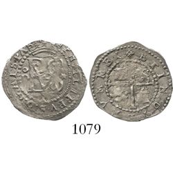 Mexico City, Mexico, cob 1/2 real, Philip II, no assayer or mintmark, very rare. 1.7 grams. Broad flan with full monogram and cross, much legend, cru