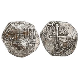 Potosi, Bolivia, cob 8 reales, 1651E, Latin 5, with crowned-•F• (four dots) countermark on shield. S-P36; KM-19b; CT-511. 24.93 grams. Bold full count