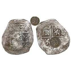 Potosi, Bolivia, cob 8 reales, (1650-1)O, with crowned script-a countermark (rare, attributed to Arequipa, Peru) on cross. S-P35; KM-19b. 26.21 grams.