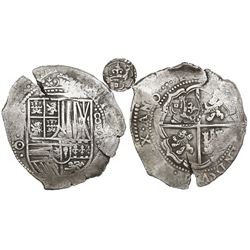 Potosi, Bolivia, cob 8 reales, 1650/9 (rare overdate), early-style date, assayer O, with crowned-Z countermark (very rare) on cross. S-P35; KM-unl.; C