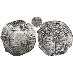 Potosi, Bolivia, cob 8 reales, 1650O, early-style date, with two countermarks (rare): crowned-T (rare) on shield and crowned-L on cross. S-P35; KM-19b