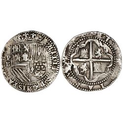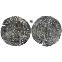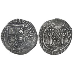 Lima, Peru, 1/2 real, Philip II, assayer R (Rincon) to left, obverse legend ending in HISP-. S-L1; KM-3; CT-702. 1.64 grams. Choice, non-salvage VF wi