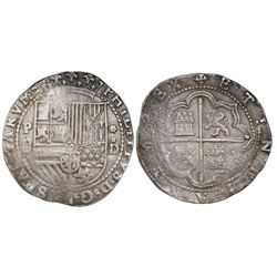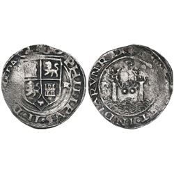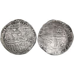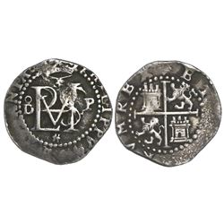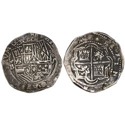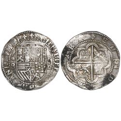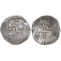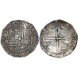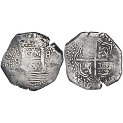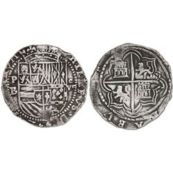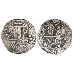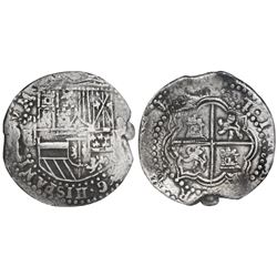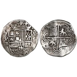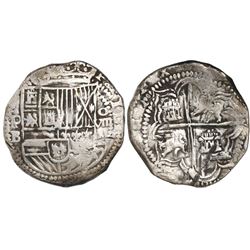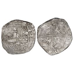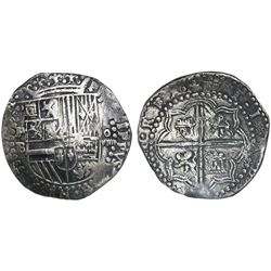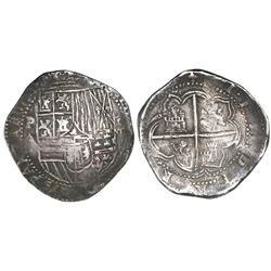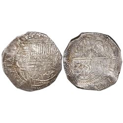 Potosi, Bolivia, cob 8 reales, Philip II, assayer B (3rd period). S-P10; KM-5.1; CT-158. 26.52 grams. Bold full shield and cross, some bold legend, we