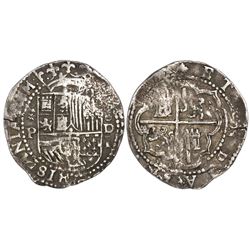 Lima, Peru, cob 8 reales, Philip II, assayer Diego de la Torre, P-8 (flat top) to left, *-oD to right, ex-Huntington. S-L4; KM-14; CT-147. 27.45 grams
