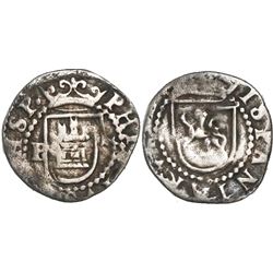 Lima, Peru, 1/4 real, Philip II, assayer R (Rincon) to left of crowned I, legend starting on that side, very rare. S-L1; KM-1; CT-761. 0.56 gram. Broa